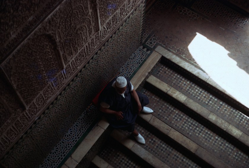 Next Image 68A3882C-F8D7-401D-99D4-7FDAB4CFFFF6 Just off the street, in the medrasa Bou Inania, a Fassi rests his feet