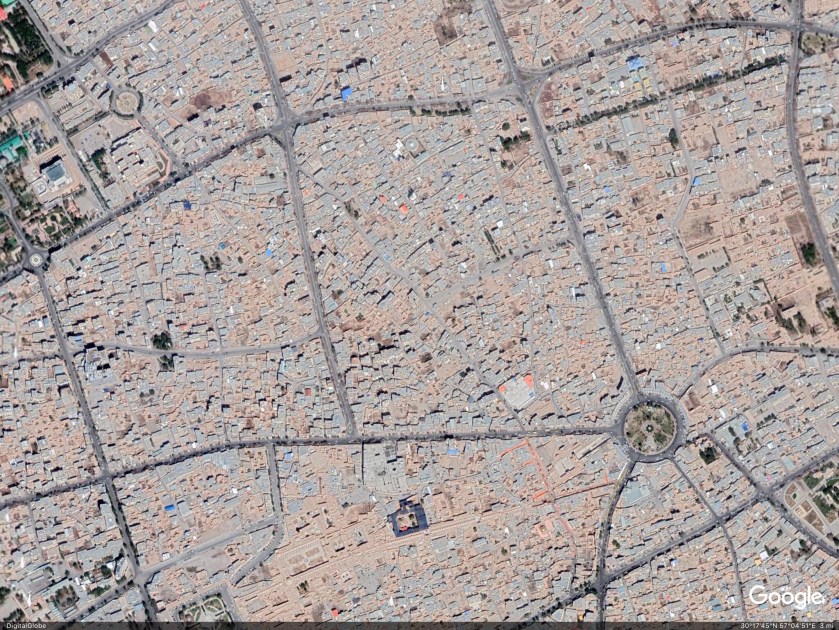Vue de Kernan, Iran, par Google Earth. À noter les nouvelles avenues qui encadrent des rues traditionnelles.