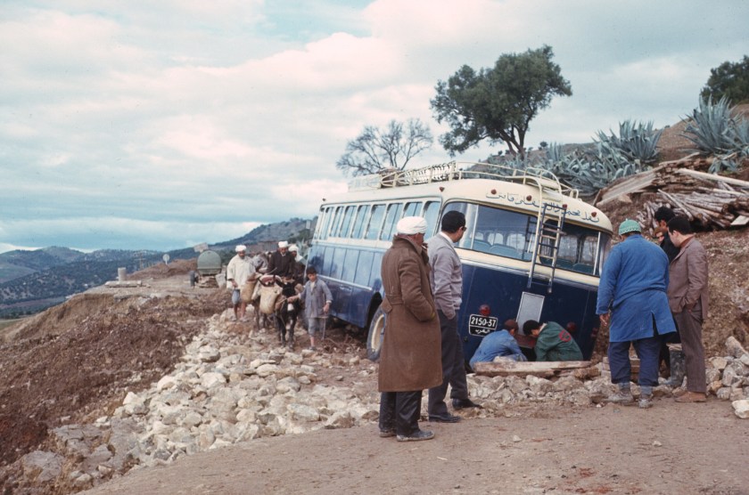 Sur les routes pluvieuses ou montagneuses, dont le Maroc regorge, on risquait souvent des retards. D’habitude, une fois les bagages mis sur le toit du véhicule, on pouvait regarder le paysage plus ou moins dans le confort. J’ai pu lire pas mal de livres pendant mes nombreux déplacements au Maroc. Les chauffeurs étaient toujours professionnels, et répondaient aux requêtes raisonnables. Je me rappelle encore le jour où j’allais à Rabat avec mon copain Gaylord Barr. Il était indisposé et attendait désespérément un W.-C. Ne pouvant pas attendre l’arrivée à Rabat, il a prié le conducteur de le laisser descendre à côté de la route. Il est disparu derrière le premier arbre, et n’a repris son voyage que sur un car suivant plus tard ce matin-là!