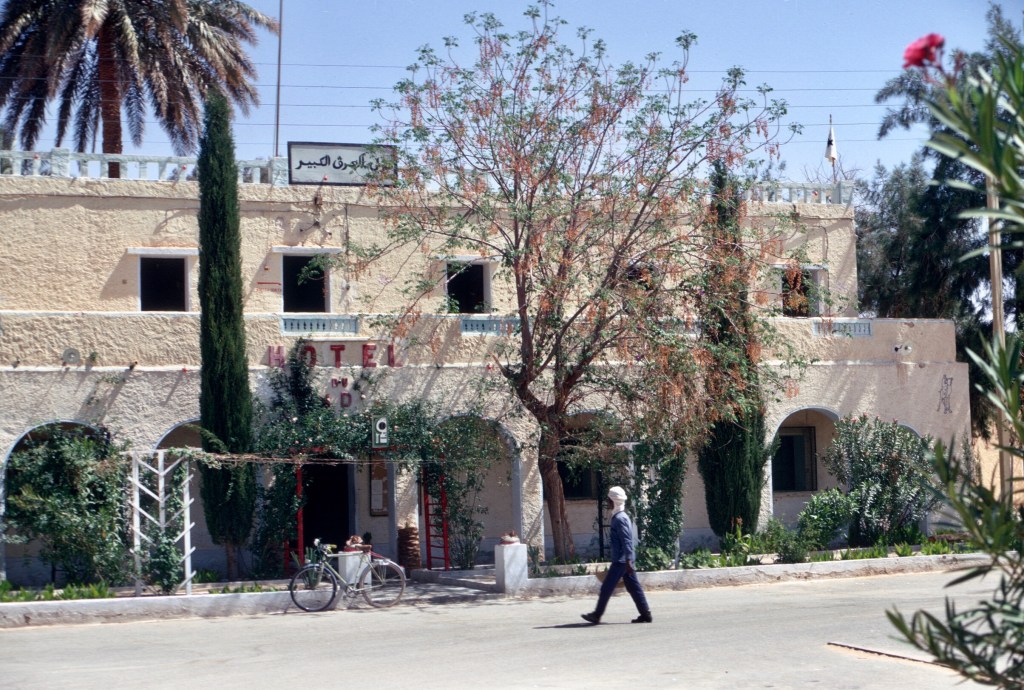 We did not really know our way around, and decided to continue by public transport to smaller towns where hitchhiking might be easier. We took a bus to Bou Hanifia and Hamamet, then hitched to Mascara, spending the night. The hotel there has twenty-foot high depictions of Mickey and Minnie Mouse, as well as other Disney characters. The next day we continued on through Frenda to Tiaret where we spent another night.