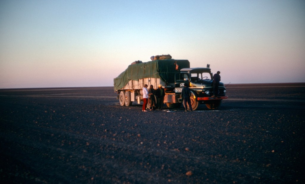 The first motorized traffic that connected the oases along the route with Tamanrasset occurred about 50 years before our trip, but the road was still not paved beyond El Golea in the nineteen-sixties. I do not recall seeing any private cars crossing the desert while we traveled, though there might have been a few; there were a few abandoned wrecks. The truck traffic was light. There were also scheduled buses as far as Tamanrasset, but not every day. As I write, the names of the places and countries come easily, but countries such as Algeria, Mali and Niger were immense and remote, something a simple and short name cannot convey.