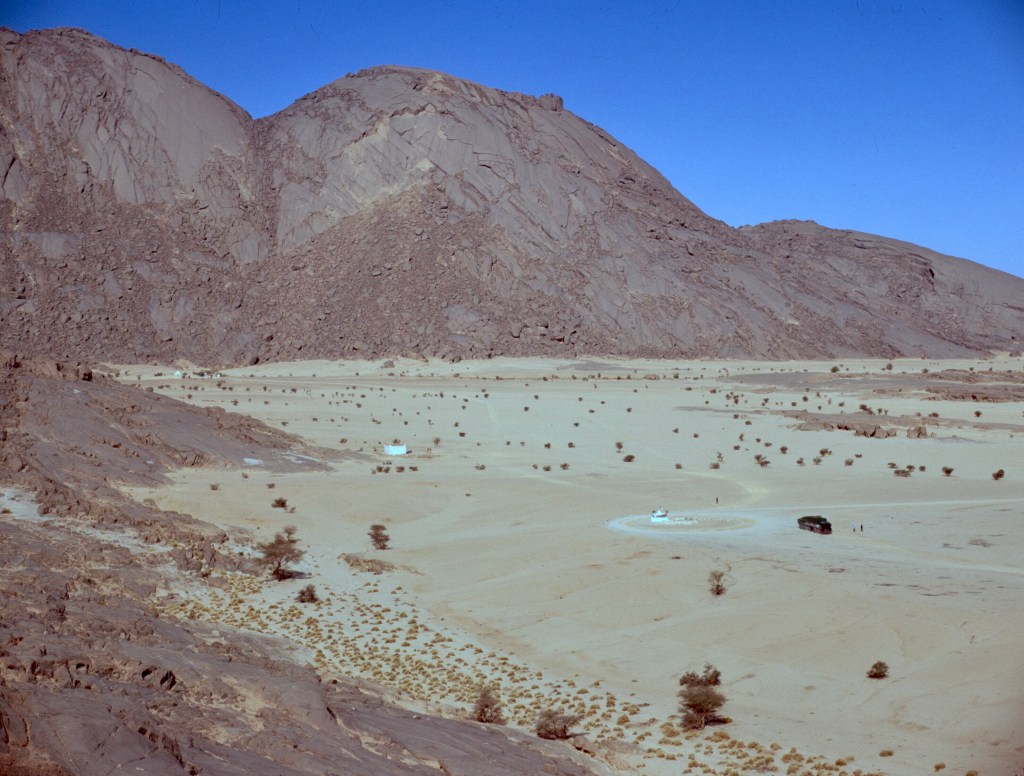 Widely spaced acacia trees, in bloom, covered the plain at the base of the mountain, and I remember it as one of the prettiest spots in the desert. Today the paved road skirts the site, and a detour is necessary to visit it. The little marabout no longer seems to exist, and the spot is marked by piles of rock.