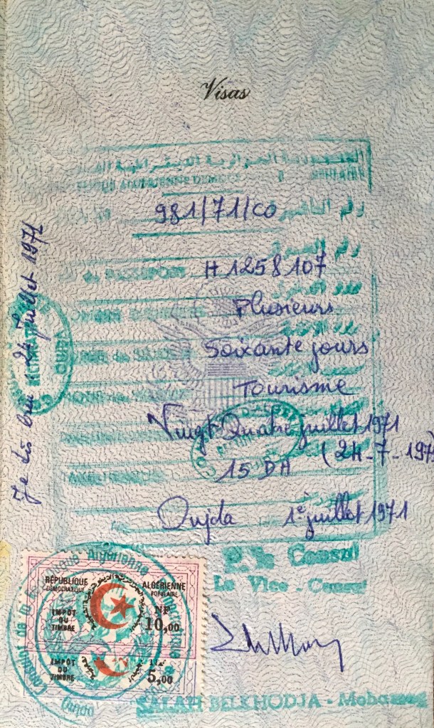 Tensions along the contested eastern border led to military skirmishes with Algeria in the early sixties, and Algeria was closed to volunteers, not by the Algerians, but by Peace Corps rules set by the U.S. State Department. We were not allowed to visit Algeria. That was a great shame, as the country was safe, similar to Morocco but different in distinct ways, and had many things to see. The United States had been sympathetic the Algerians’s demands for independence, but that independence had come with much more struggle and violence than Morocco’s, and the government in Algiers was nonaligned. Sadly, the Cold War was playing in theaters everywhere then, and Washington had decided Algeria was just much too dangerous for Americans. Peace Corps volunteers did sometimes ignore travel restrictions, but stamps in a passport could be incriminating: Algeria required a visa for Americans.