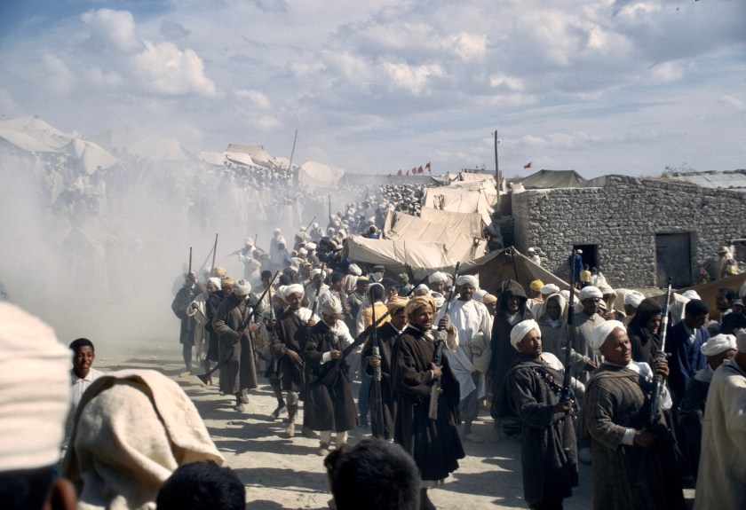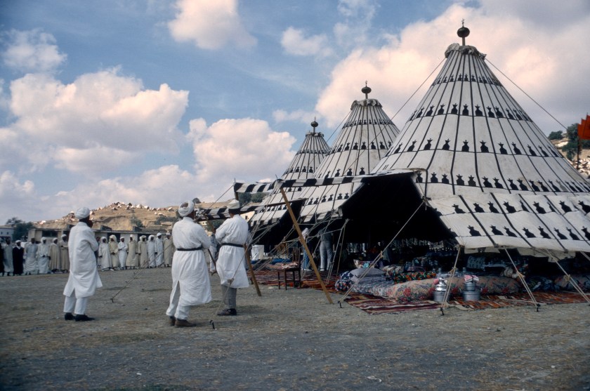 Je ne me souviens plus comment je m’y suis rendu, mais étant donné que j’ai passé du temps des les tentes gouvernementales, j’étais sans doute avec d’autres personne du ministère. J’avais souvent à travailler dans la région au nord de Fès. Je n’ai aucun souvenir d’avoir mangé, mais on a dû me donner à manger. En ce qui me concerne, l’événement lui-même était un festin pour les yeux.
