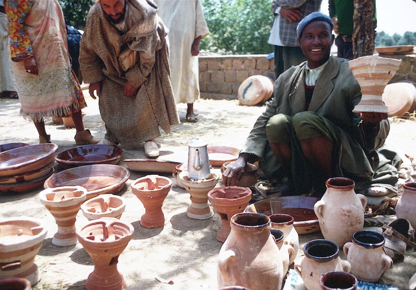 Des visiteurs montaient des tentes et campaient en plein air autour de la zawiya créant ainsi un croisement entre un village et un souk (marché). Des biens et des services se vendaient ou s’échangeaient entre les commerçants et les locaux, et les rues principales de cette ville de tentes ressemblaient à un marché rural, ou souk, comme on en trouve partout au Maroc. Les visiteurs au moussem avaient besoin de nourriture, de services et, peut-être, d’offrandes. Ce qui est différent, c’est que les vendeurs dans un souk se groupent d’habitude dans un espace central, alors qu’ici ils se plaçaient le long des artères qui passaient à travers les tentes des visiteurs.
