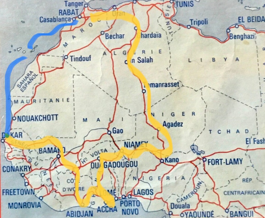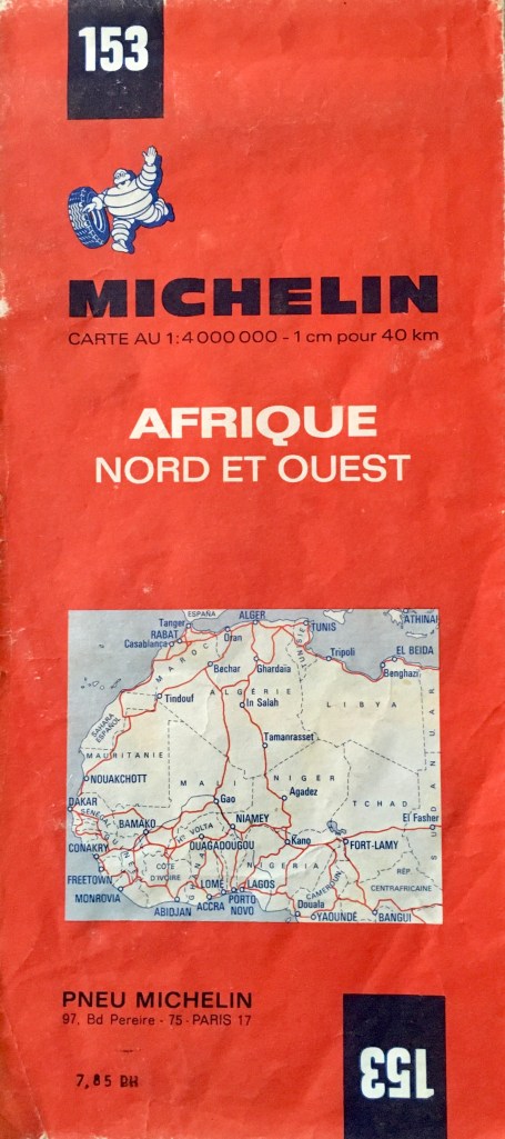 We had no specific knowledge of hostel locations, apart from those in the capital cities, but we hoped to meet volunteers in the first towns of Niger who might help us. In hindsight, we could have been much better prepared, and I do not seem to have even recorded where we were and when. In writing about the Saharan trip, I needed help from Anne on the chronology and the places where we stopped while crossing the desert. As for the trip through West Africa, I would have been lost without her notes. They contain places and incidents that I’d forgotten entirely. Furthermore, she jotted down her own observations, and I have incorporated them occasionally.