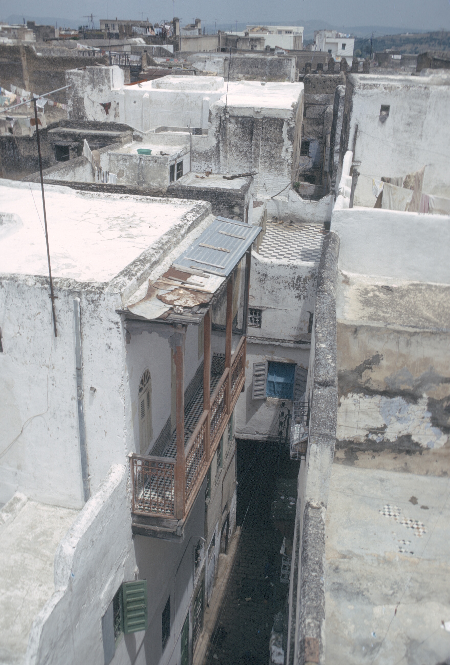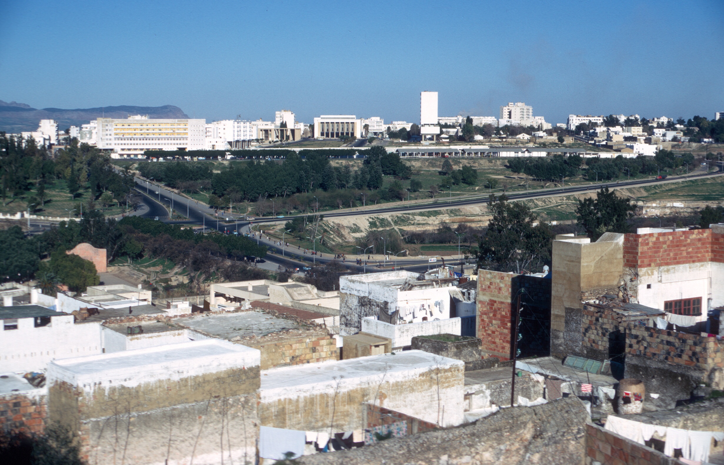 Across the roof tops of houses in the Meknes medina, looking at the ville nouvelle, which is separated from the medina by a valley. Note the modern construction. 1973.