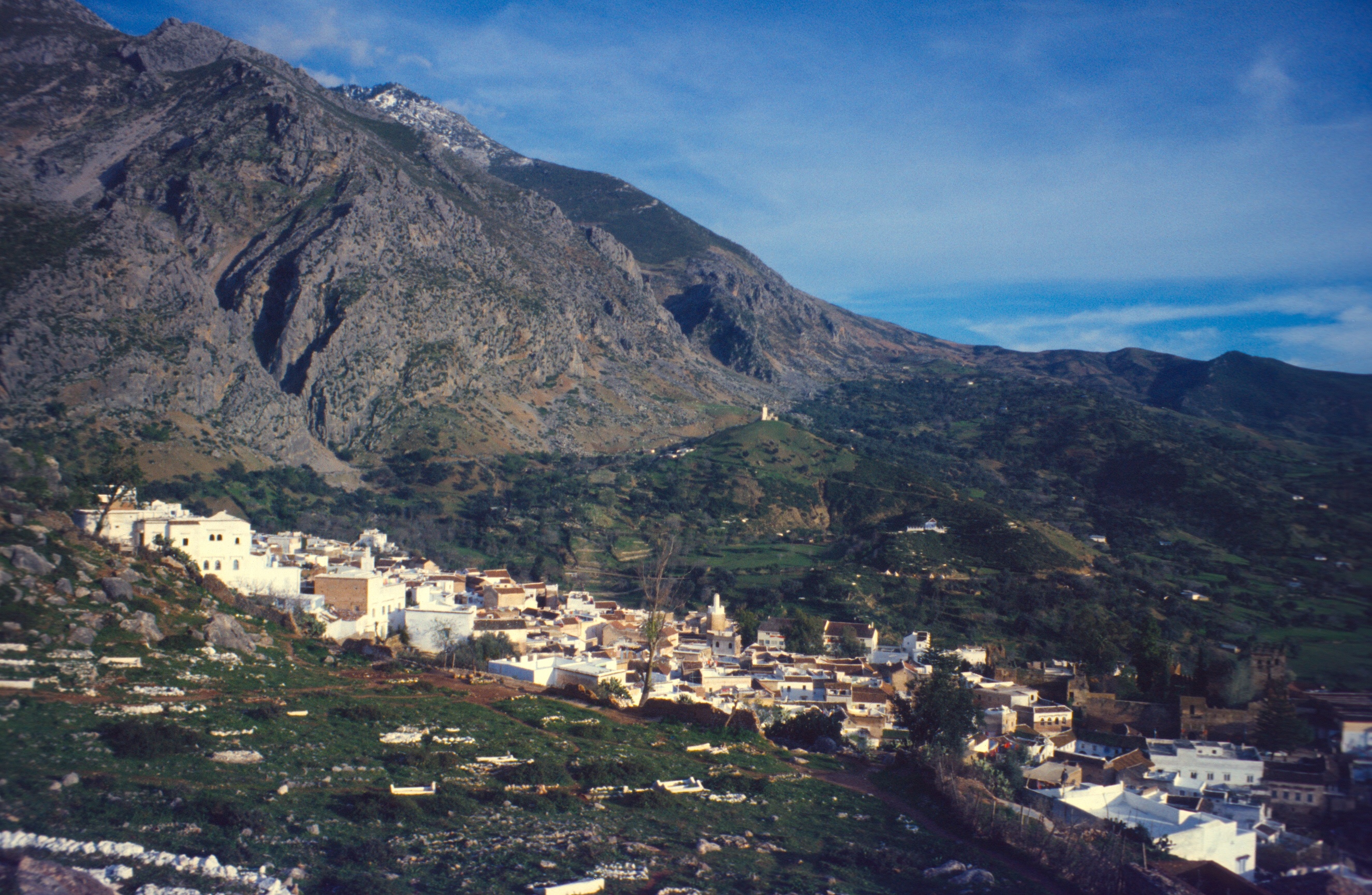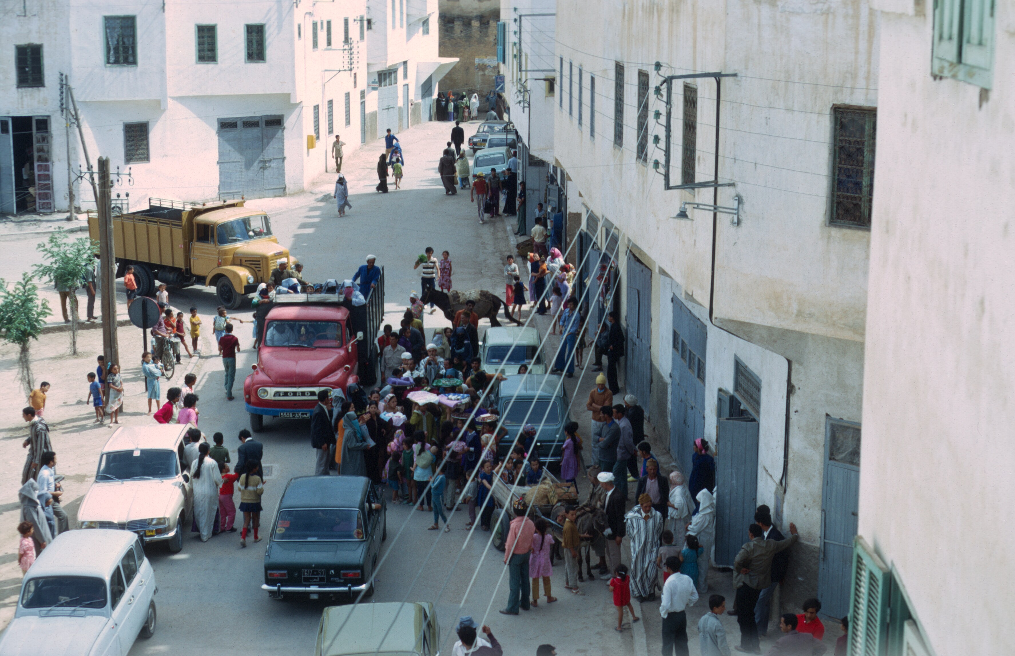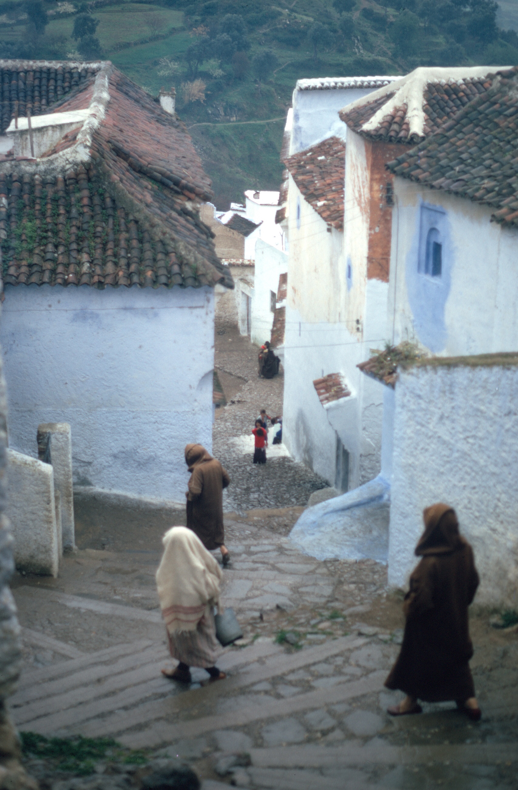 Built on a mountainside, Chauen has streets that climb and wind. 1976.
