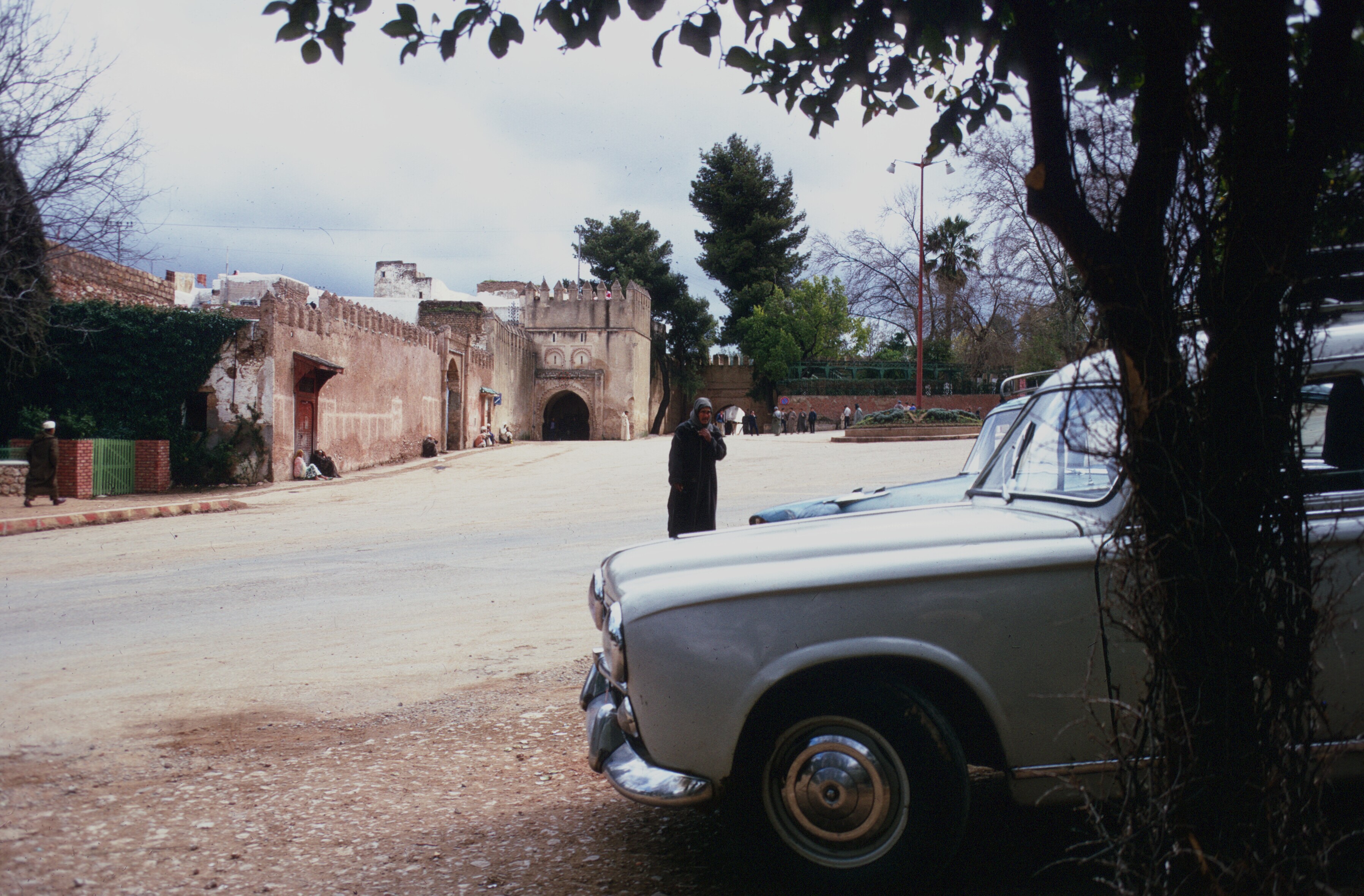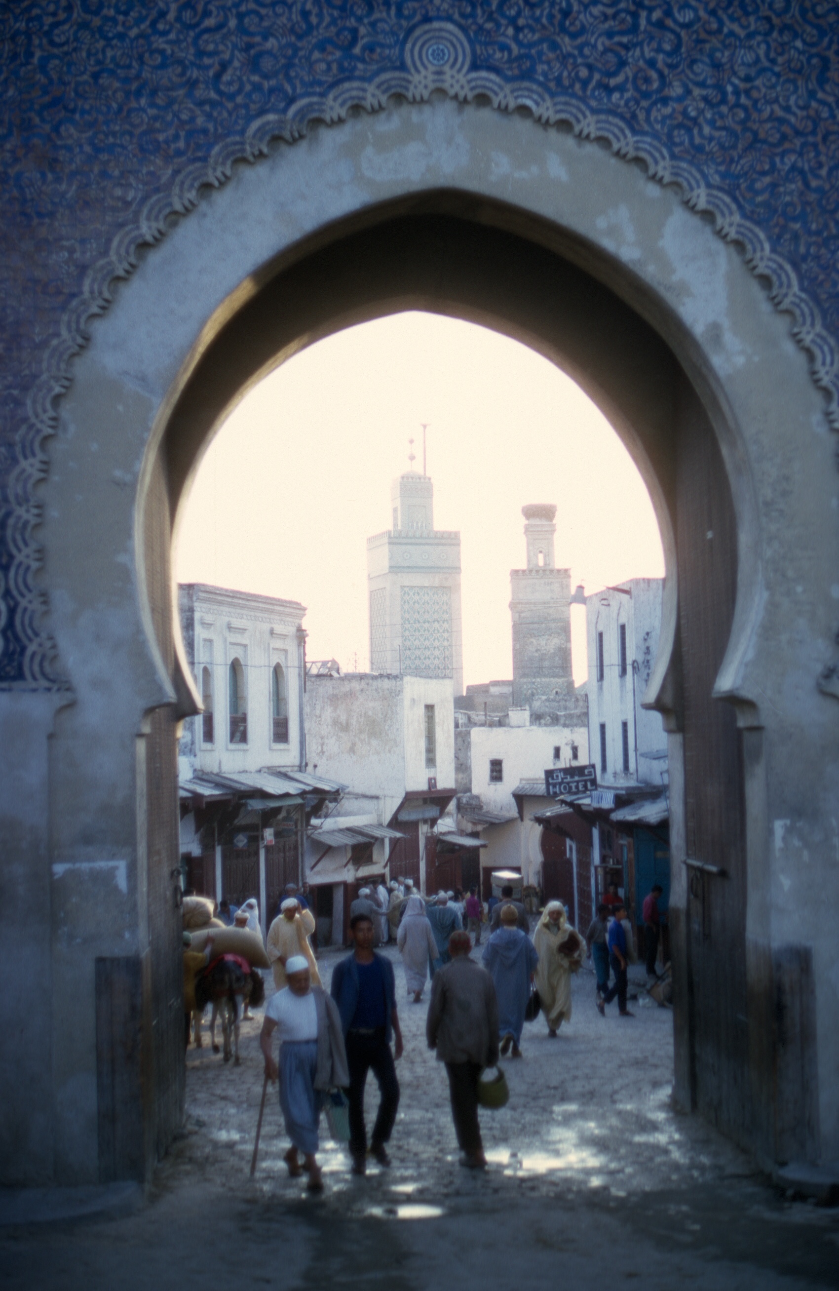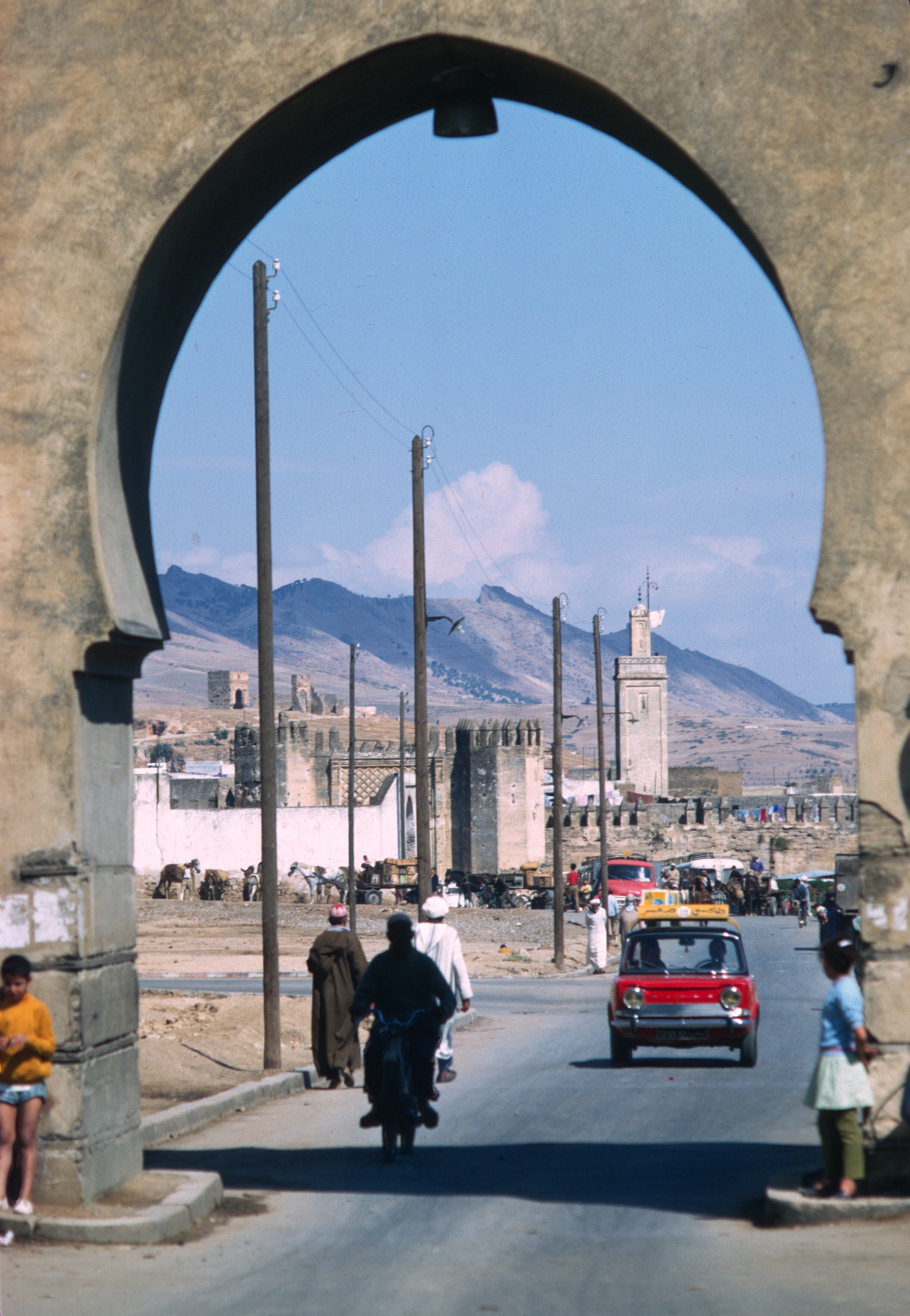 Fes, 1970. Early morning at the Boujouloud Gate, from which two major streets descend into the heart of the city.