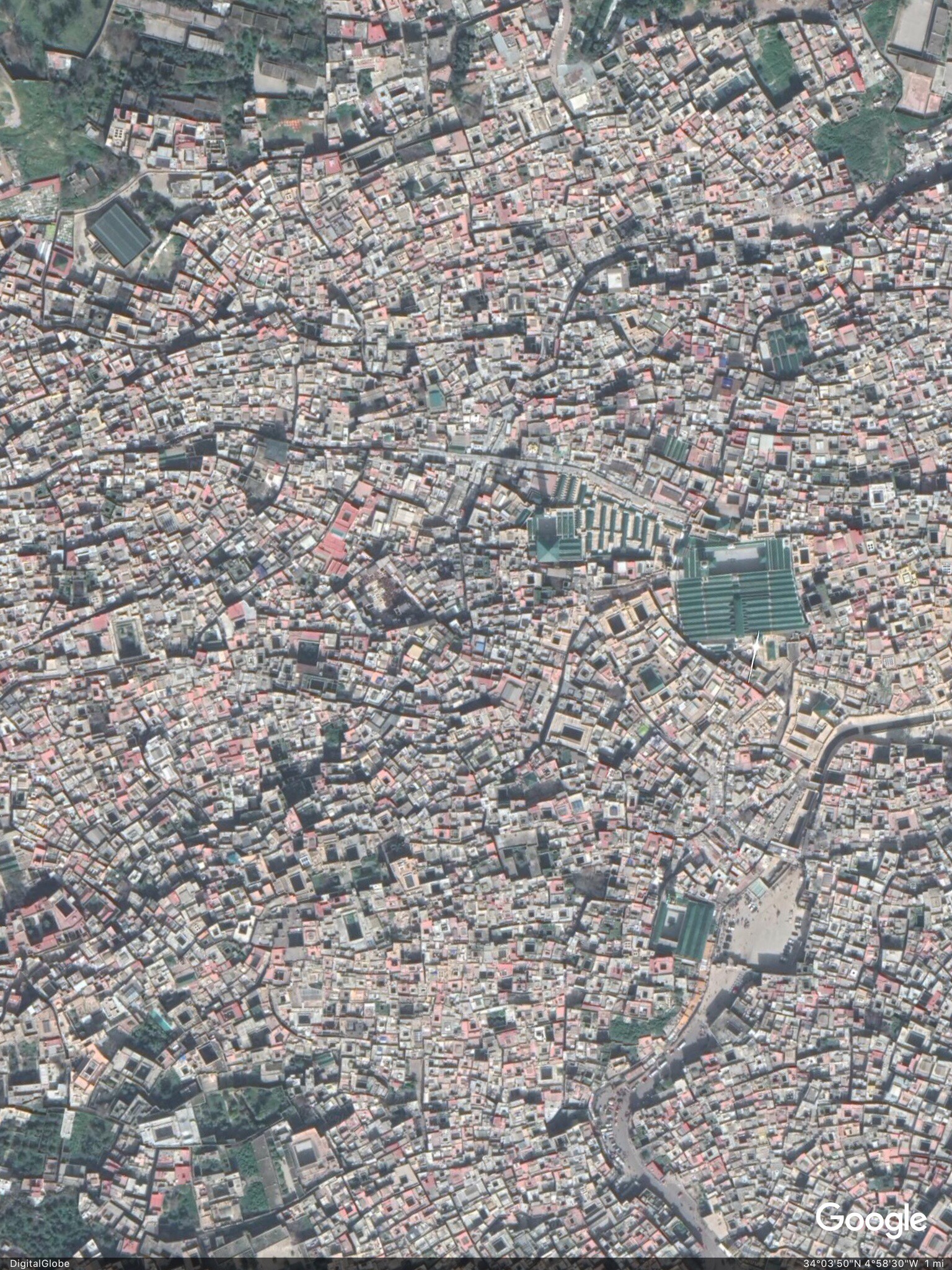 Fes today. Notice the winding streets. The large road leading into the medina accommodates tourism buses and trucks. It was not there in 1969. Courtesy of Google Earth.
