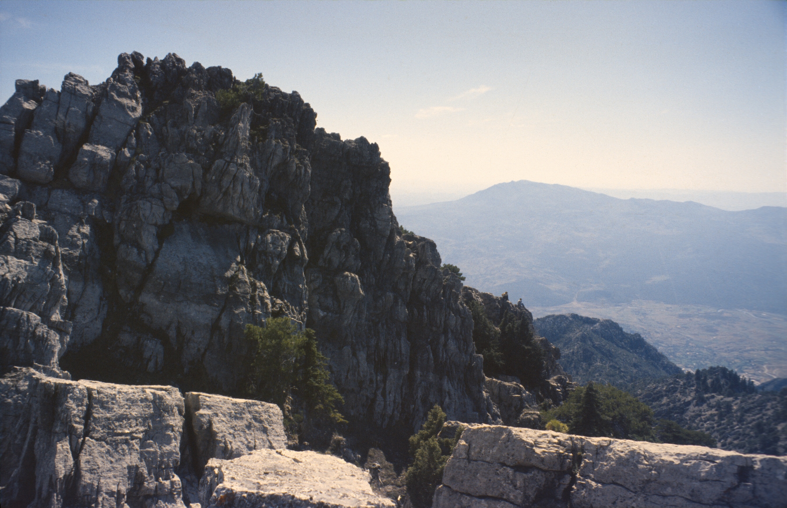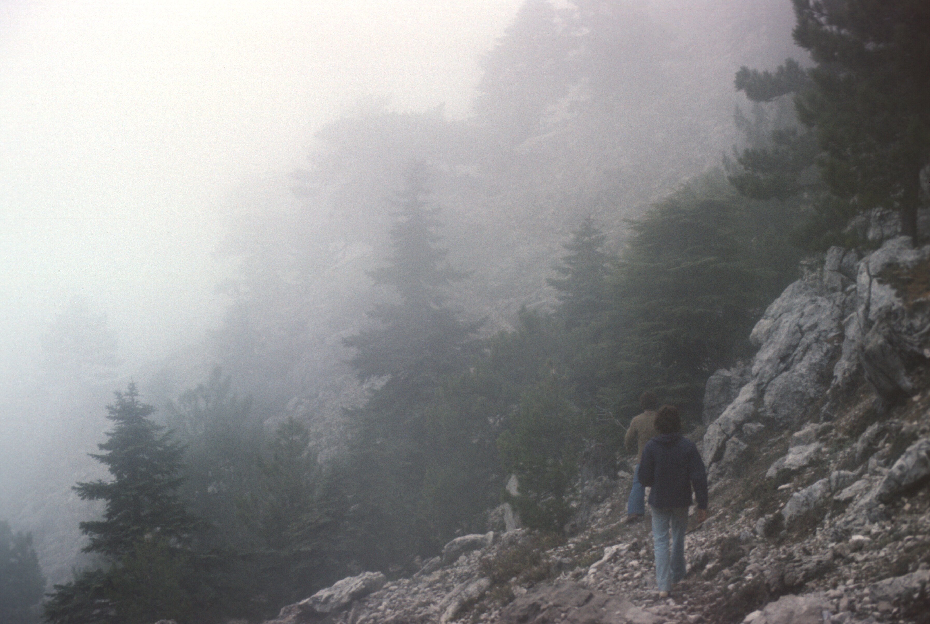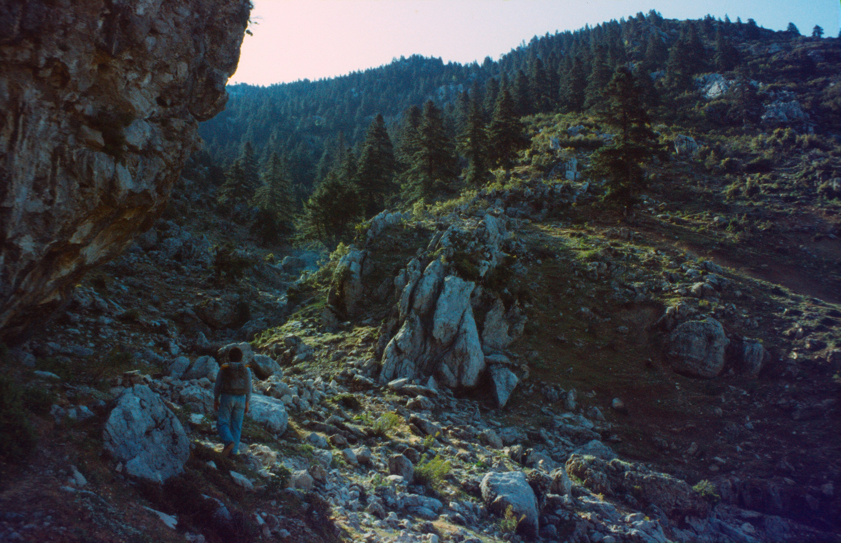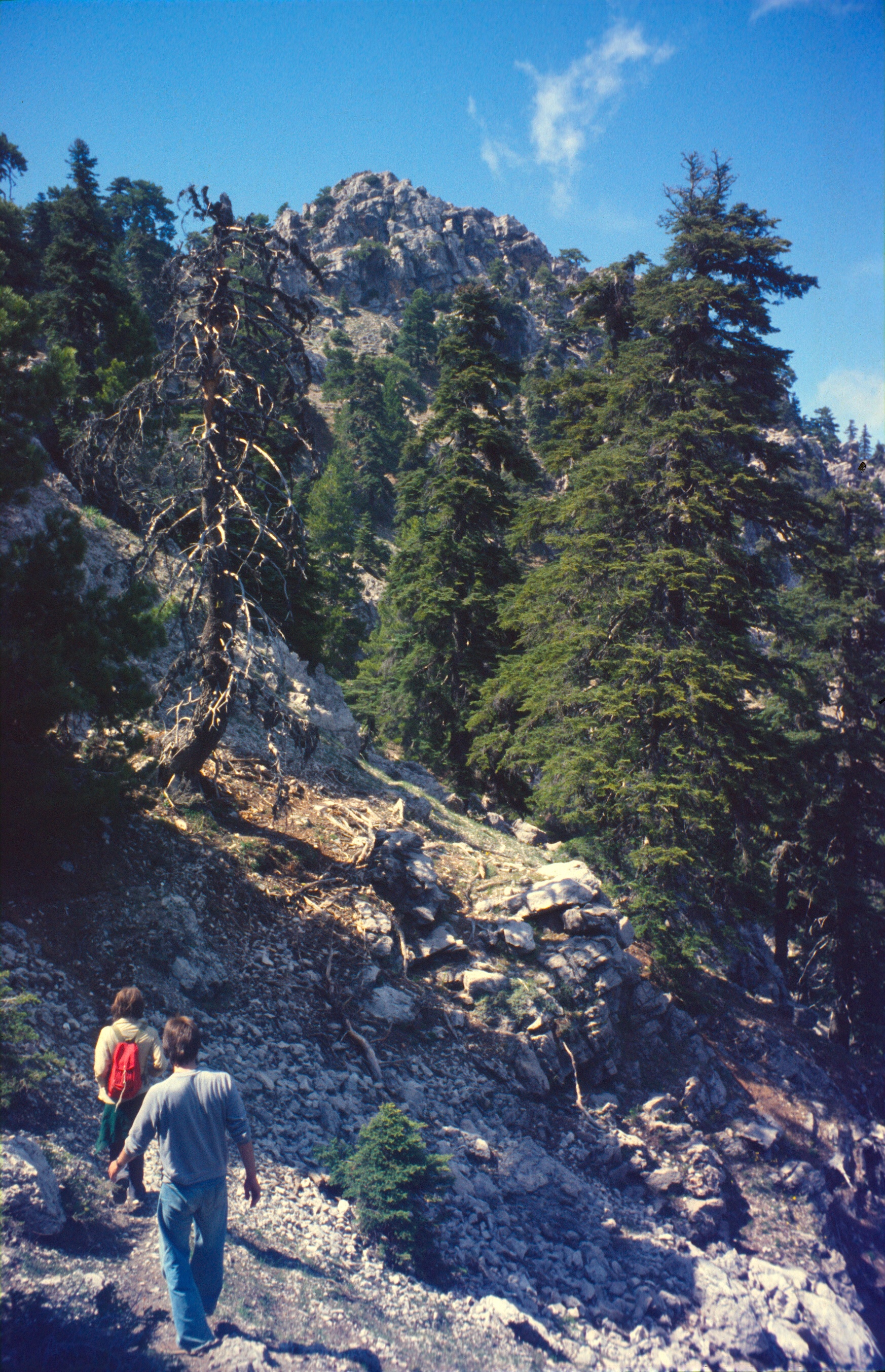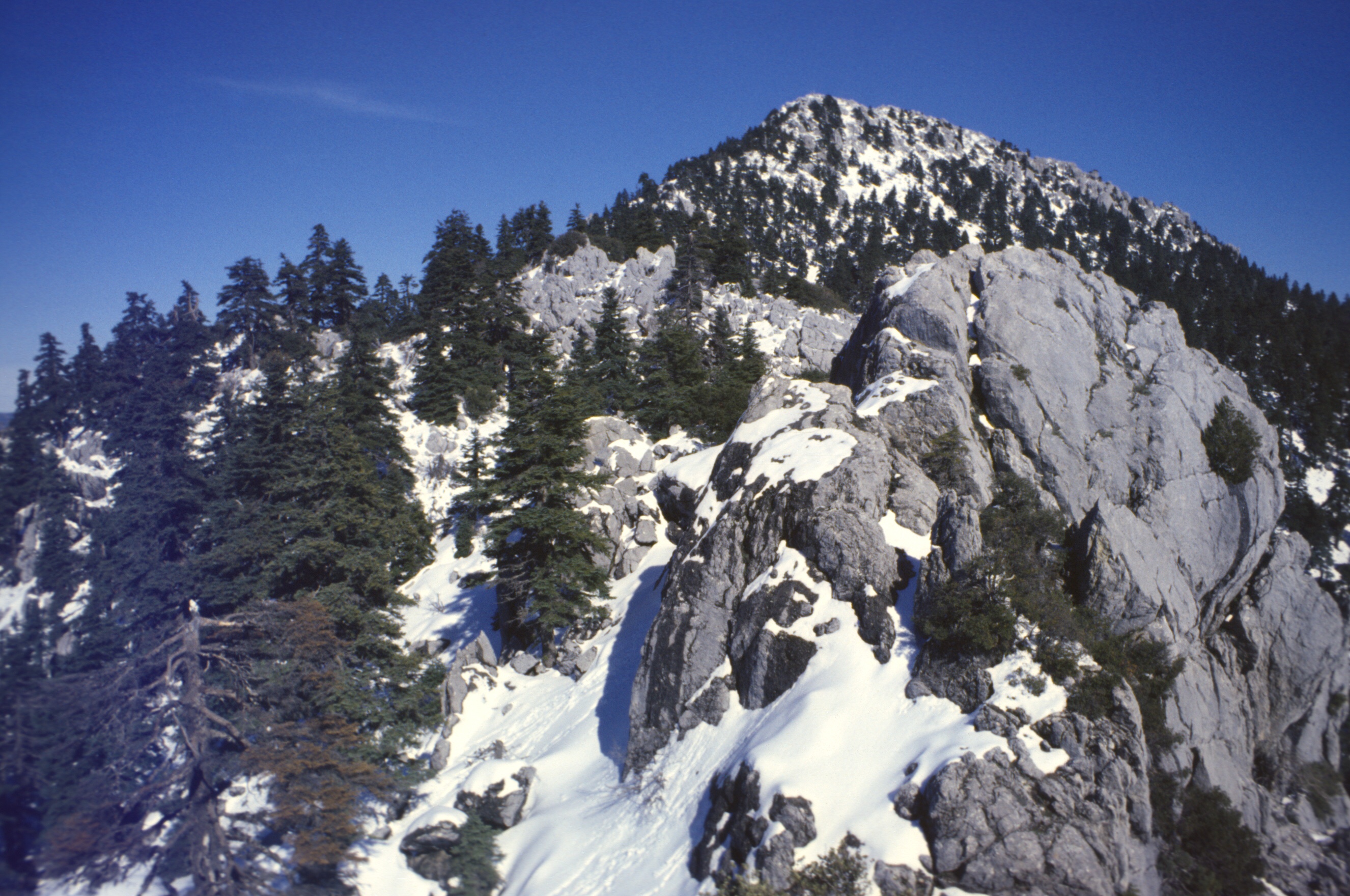 We left about sunrise, and the mountain shots are dark. There is a narrow gorge on the initial approach, with vertical walls and a stream flowing through it. Afterwards we just continued up through the valleys that lead to the summit. Louden and I had done the climb before, and there was little difficulty finding the route.
