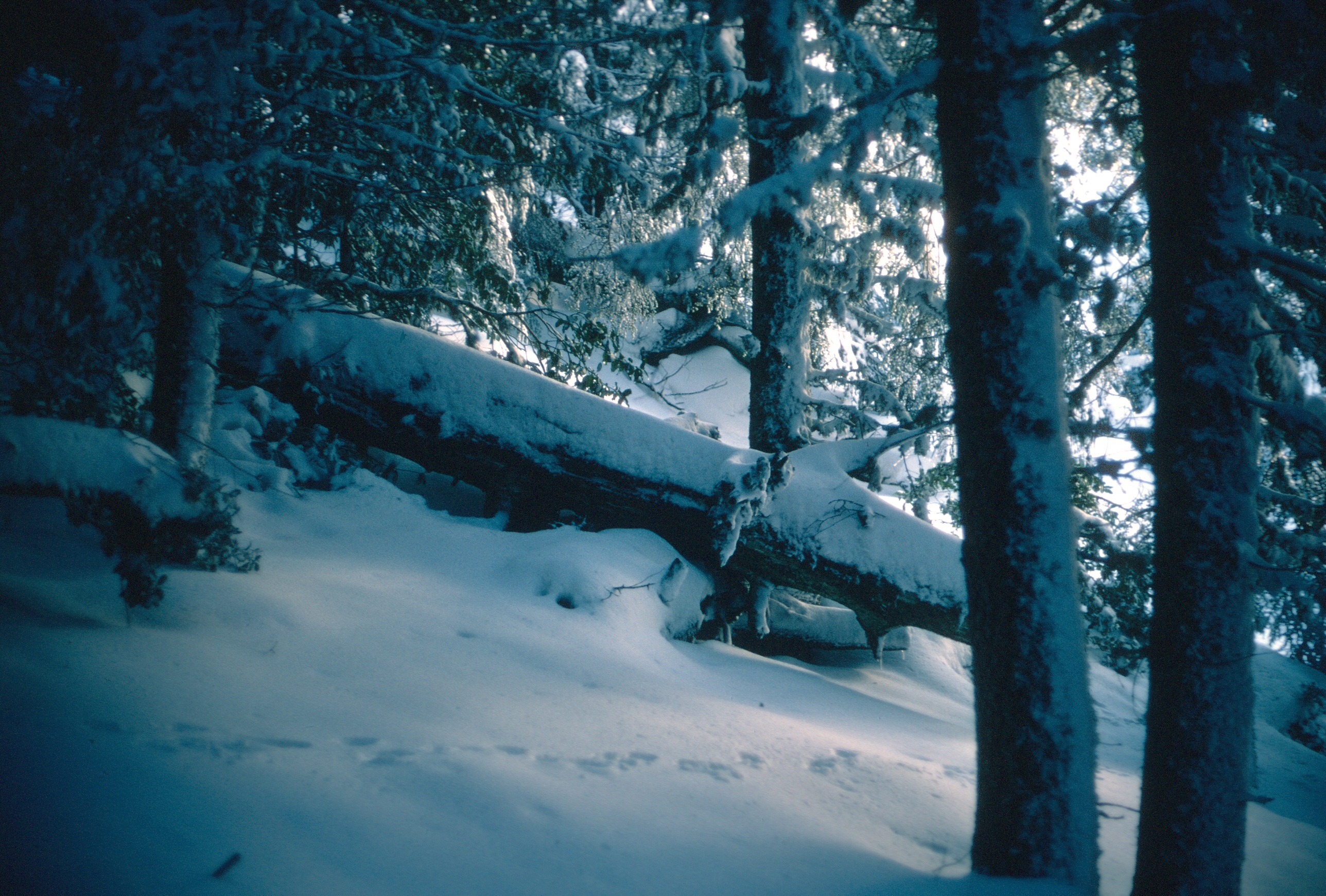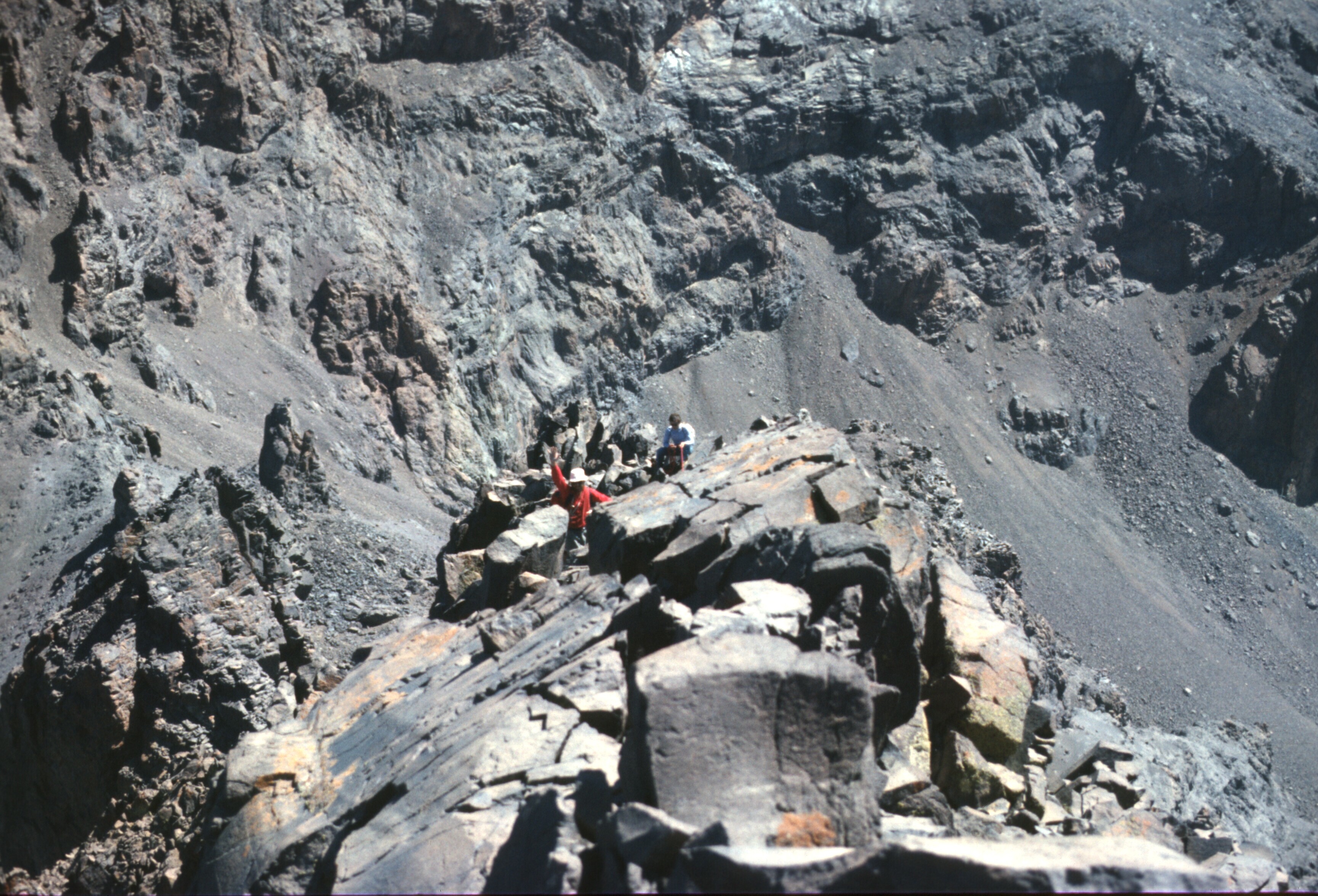 Out of breath from the altitude and the march, Don decided that he had had enough and stopped in the large basin about 500 feet below the 12,300 foot peak’s two summits. There he waited until Louden and I returned, hence, no footage from the summit, though Louden and I took 35mm slides. I am the guy with all the sunscreen on his face, and the red cap. Don appears briefly in his yellow parka.