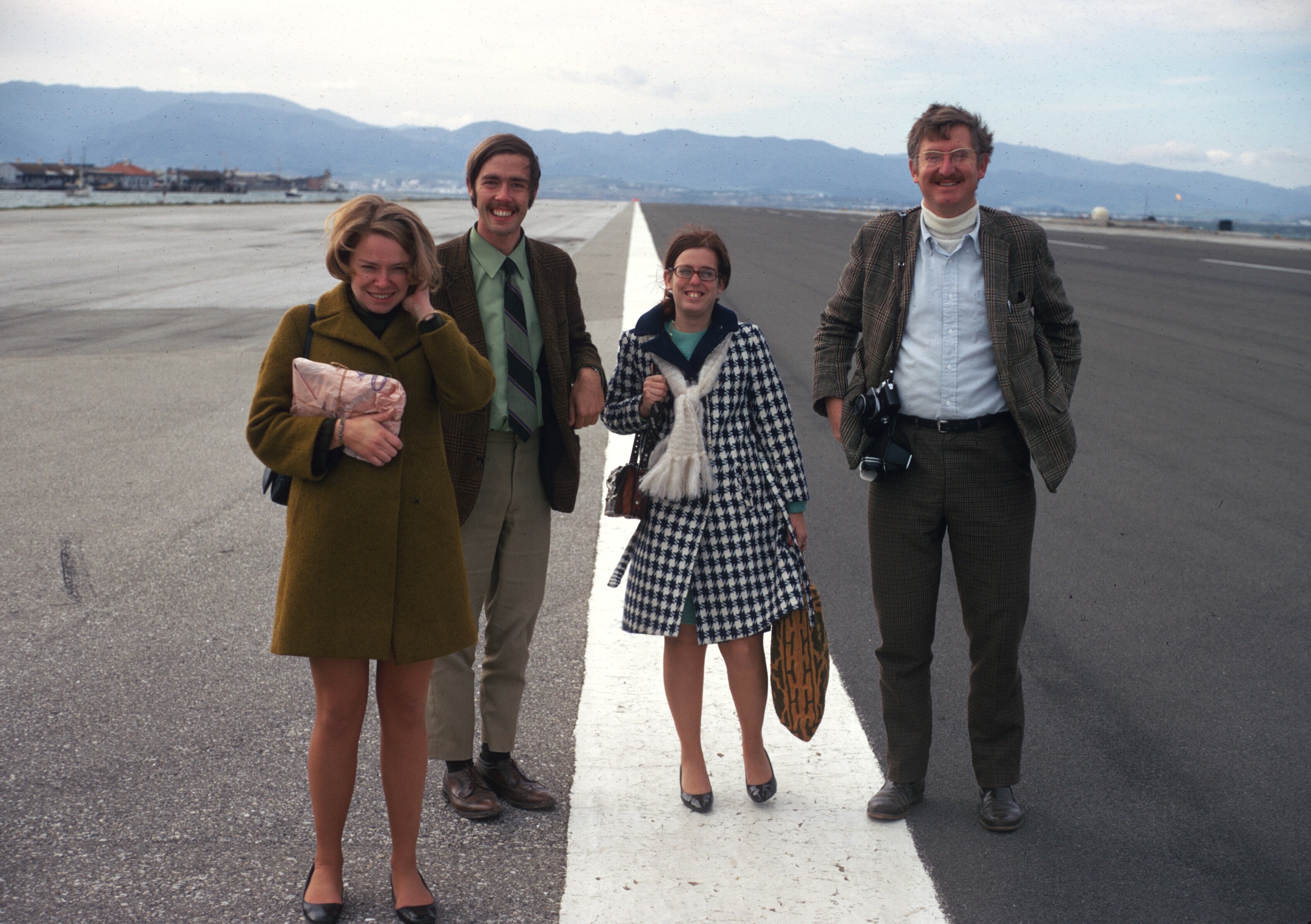 Marty, Gaylord, Eileen, and Don on the runway in Gibraltar. The runway had crossing guards as a street cut across it.