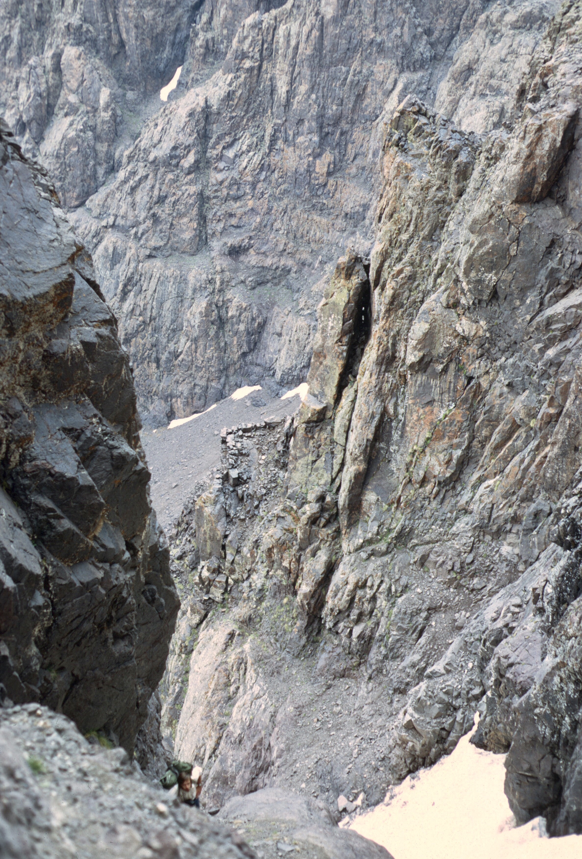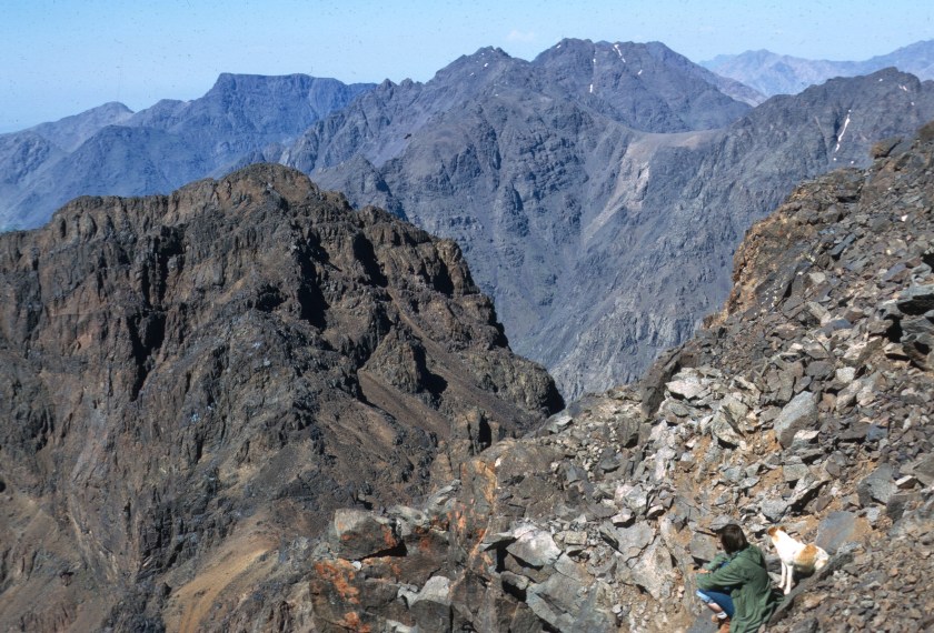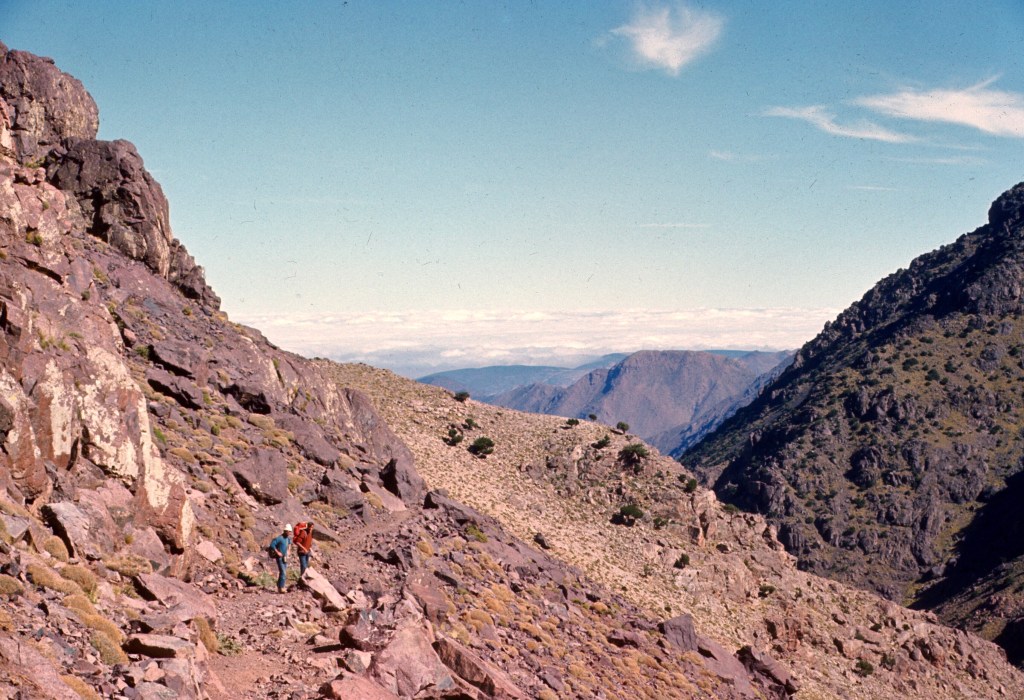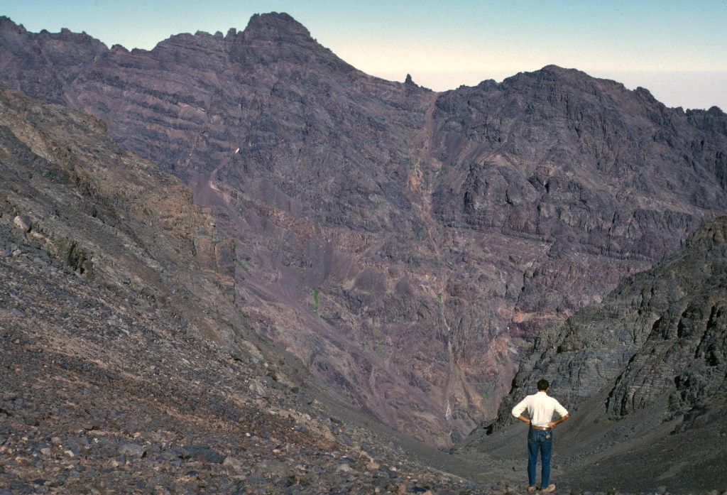 John with Louden Kiracofe en route to the then Neltner HutJohn, on the shoulder of Jbel Toubkal, looking down the long scree slope in the gully that leads up from the Neltner Hut. Having hiked to the summit of Toubkal, we descended the gully in long jumps, sliding along with the scree, then kicking off again. It only took 20 minutes to reach Neltner. On the way up, by way of contrast, slipping and sliding in the scree made progress a chore. Across the valley is Tadat.