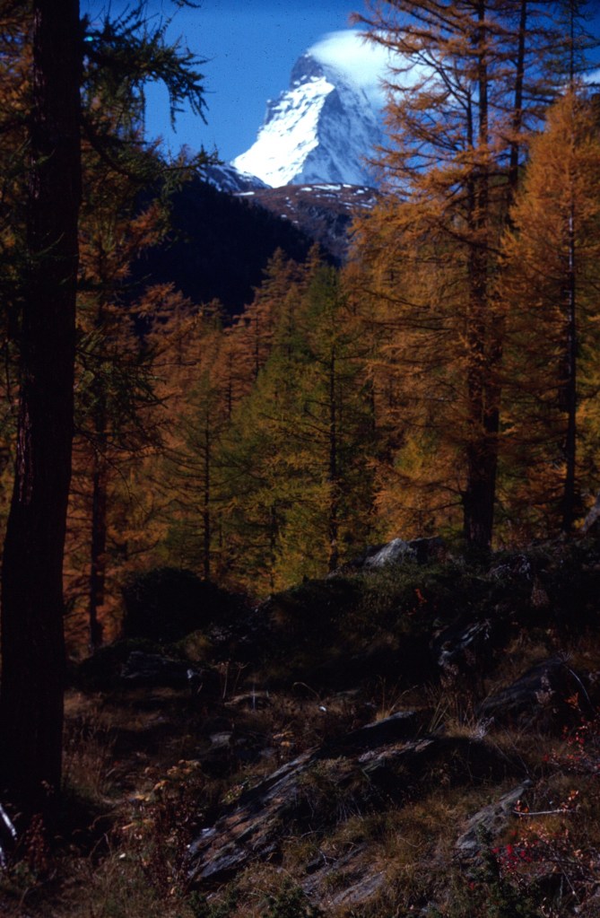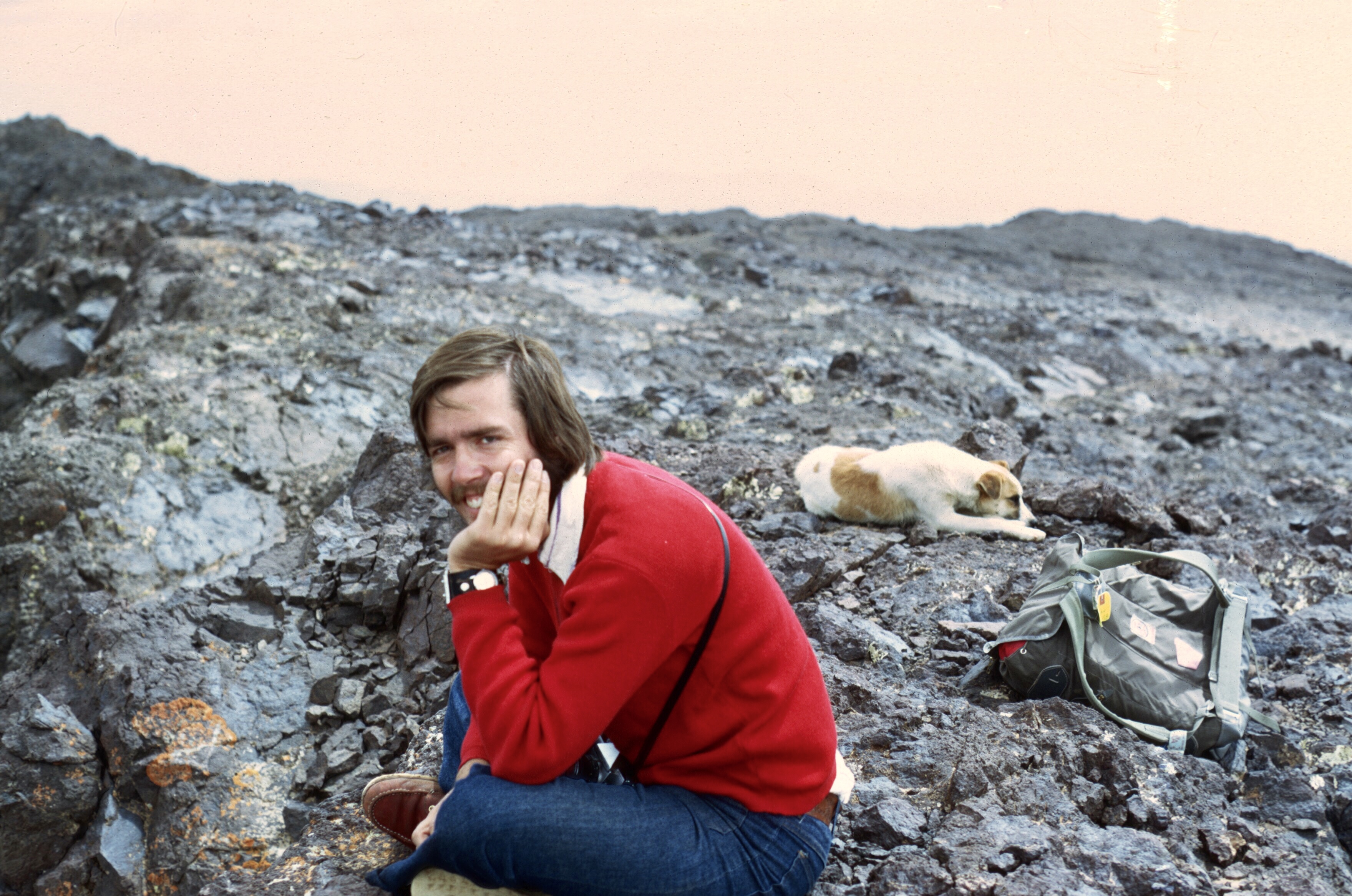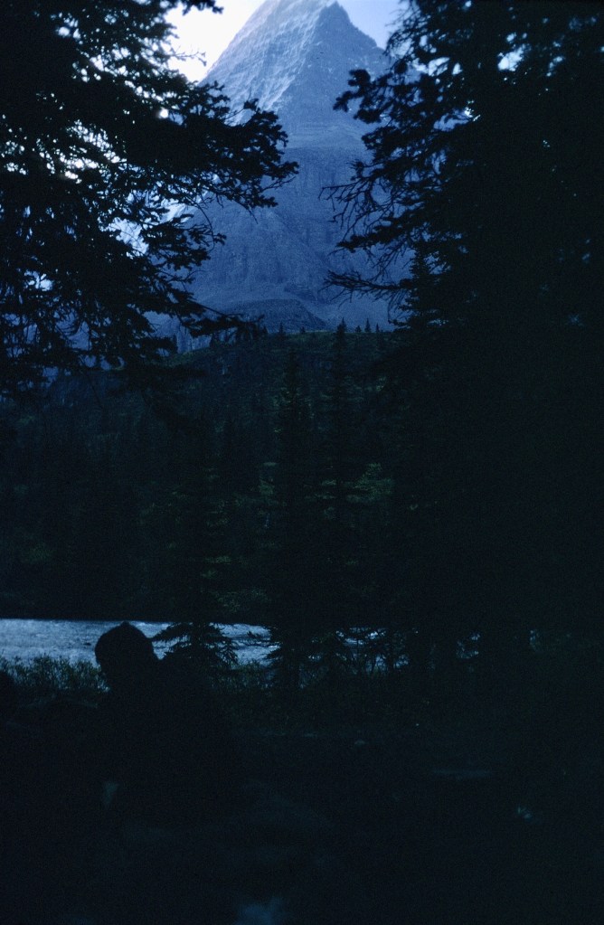 Camping in the shadow of a magnificent peak. My old Kodachrome film had neither the speed nor the latitude to capture Jim, but the mountain was still reflecting twilight.