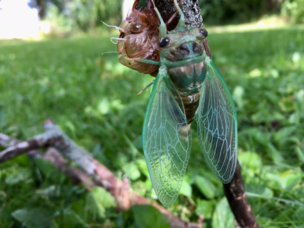 Cette cigale périodique, qui aura passé 17 ans à se développer sous terre, émerge enfin. Elle laisse sécher les ailes avant de prendre sa place dans le chœur du couvert forestier. Si par chance elle réussit à échapper à ses prédateurs, elle vivra encore deux semaines. Photo prise derrière notre maison.