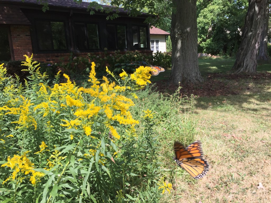 Monarchs are becoming endangered and often cannot help themselves. We as individuals can help them by doing simple things such as letting the goldenrod grow and growing patches of milkweed. Two years ago a professor of biology from the University of Maryland gave a public lecture at Niagara University, just a few miles from here. He presented his research showing that many suburban areas had become food deserts for native birds, and adding to the many other man-made hazards for migrating species. Since most birds feed their young with insects, even seed-eating species, having trees that produce those insects in abundance, especially caterpillars, and, at the right season, is crucial to the survival of their nestlings. In the same vein, migrating in the autumn, birds often eat berries. Having berries with the right nutrients and food value at the right time is important for their survival. Suburban gardens often have the wrong types of shrubs and trees, coming as they do from other regions of the States or even other continents, and even local species vary greatly as to the quality and quantity of food they offer.
