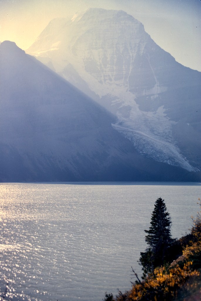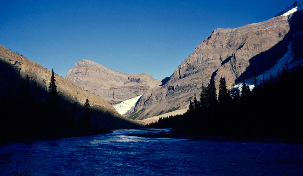 The Berg Lake trail is not demanding, but we carried heavy gear. The days of lightweight synthetics were still in the future. Jim was in good shape, but I struggled a bit to keep up. By the time we climbed out of The Valley of a Thousand Falls, I was beat and we camped at a spot near the exit of the Robson River from Berg Lake. The sun was setting. The September days were still warm, but they were growing short, and long before the last light disappeared from the high peaks, the valleys had fallen into darkness.