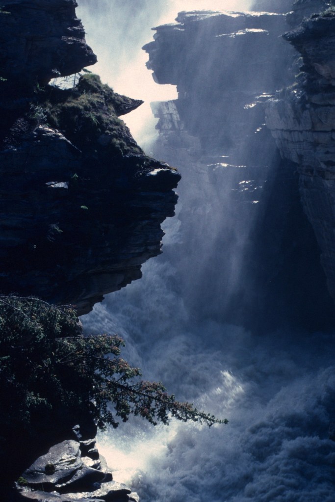 Along the Icefields Parkway, the Athabaska Falls is a cauldron.Mount Athabaska and the Columbia Icefields. The Columbia Icefields are the largest of the Rockies, and mark a point where the Continental Divide meets the Arctic watershed. Waters from the ice fields flow toward the Atlantic, the Pacific, and the Arctic oceansI’m standing at the toe of the Athabaska Glacier, which has shrunk greatly. Today it is much farther from the road than it was in 1966 when I first visited. In those days, the glacier was a relatively short walk. Not so much today, and its recession is speeding up. I was last there in 1989, and I wish I had documented how far it had receded since my first visit. There is no danger that the Athabaska will disappear soon, though some predict that 500 miles south in the American Glacier National Park, the glaciers that give the park its name may disappear by the end of the decade. Near Jasper, the Angel Glacier, which seems to float on the side of Mount Edith Cavell, has visibly changed shape since I first saw it in 1966.