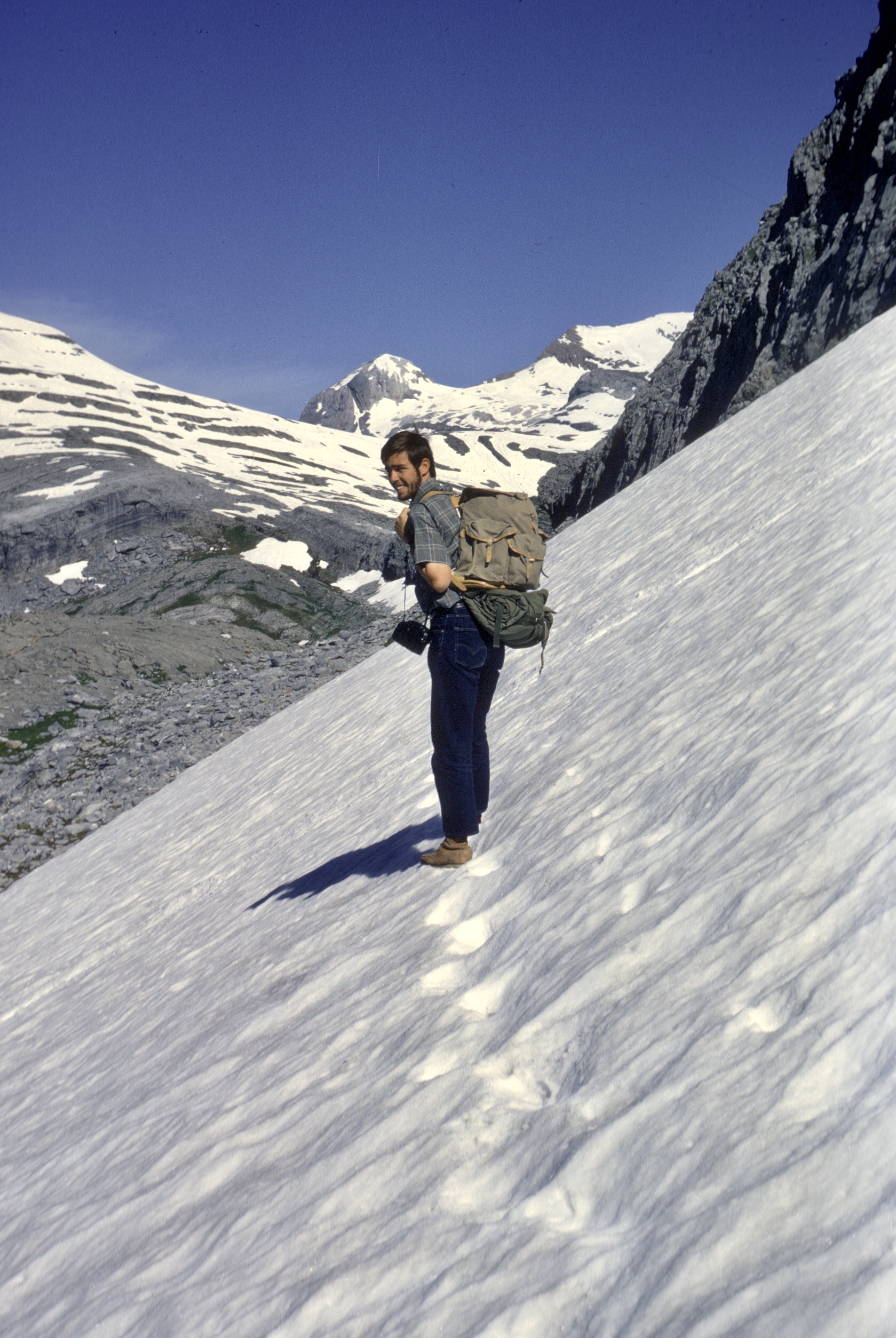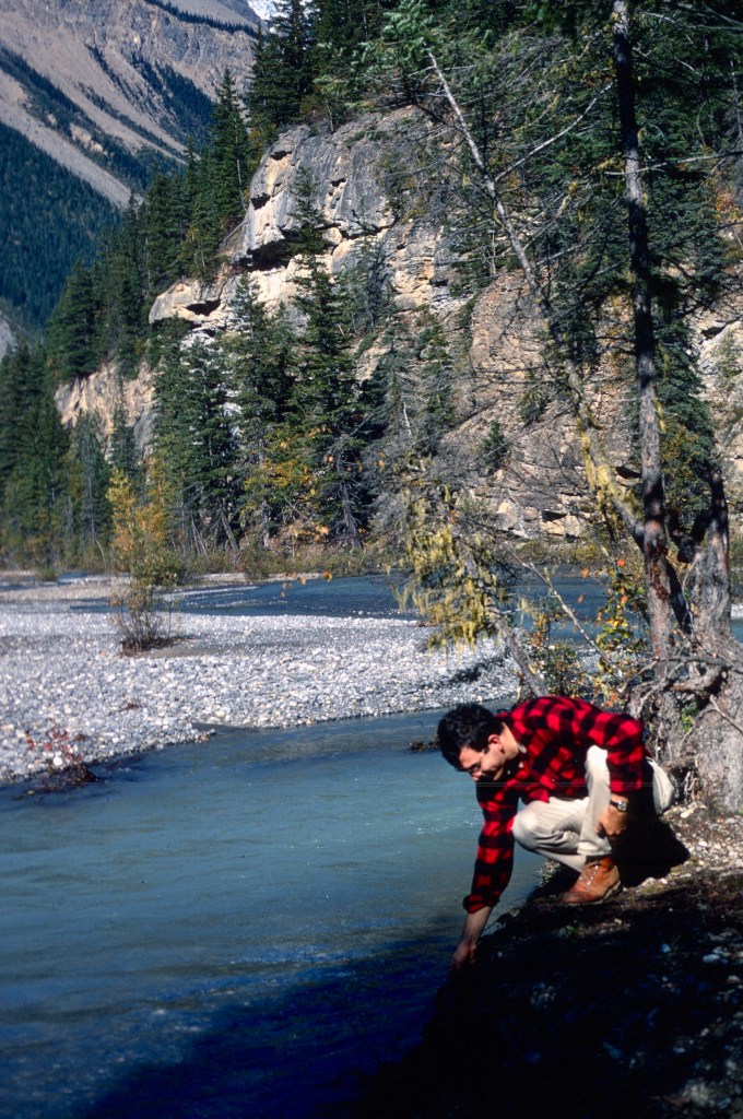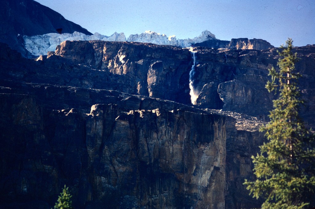 Grabbing a canteen of water along the Robson River. The boots that I am wearing are the same ones that I left behind in the Atocha Hotel in Madrid in 1969. By then I had worn them out, and since then I have always hiked in real French or Swiss mountain boots.On the shore of Kinney Lake, Whitehorn Mountain is reflected in the still morning waters.Horse trails cross the outwash plain at the other end of Kinney Lake. The hiking trail climbed along the side of the slope on the left, while the horses took an easier route as they were easily able to ford the cold, swift waters.Water and ice fell over the edges of the u-shaped Valley of a Thousand Falls. The icefalls were loud and frequent.