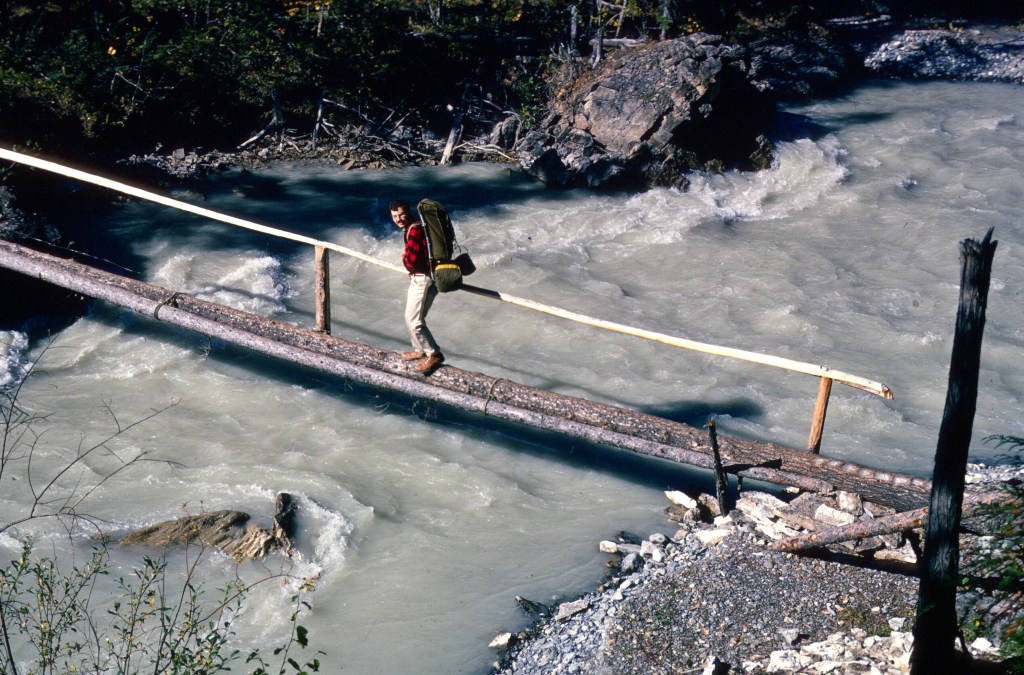 Jim near the trailhead of the Berg Lake trail, beside the Yellowhead Highway.At its beginning, the trail crossed the Robson River via a bridge wide enough for horses. Packing in with horses was a popular excursion for those who could afford it, and is still popular. While it makes the trip possible for some who might not be able to manage the hike, sharing trails with horses is not desirable.Crossing the Robson River on the bridge. The river is light colored as it carries a load of glacier scour.
