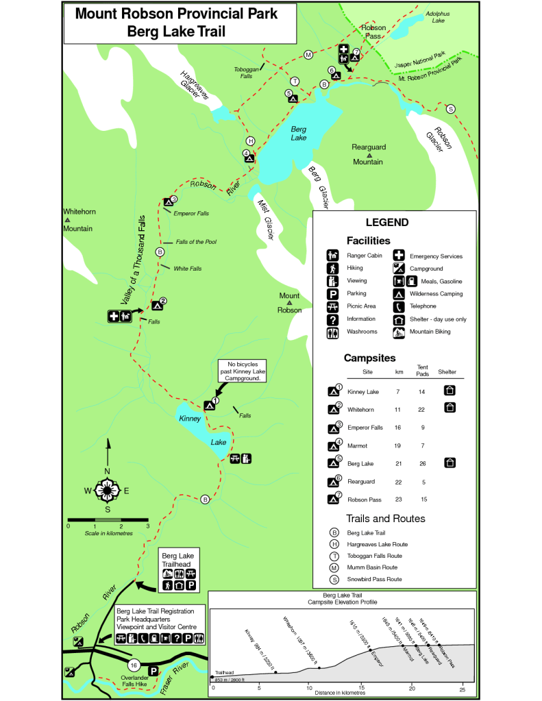 The Emperor Falls and Mount Robson.Whitehorn Mountain and the Robson River seen from the Berg Lake area.Approaching our campsite, the second night out.