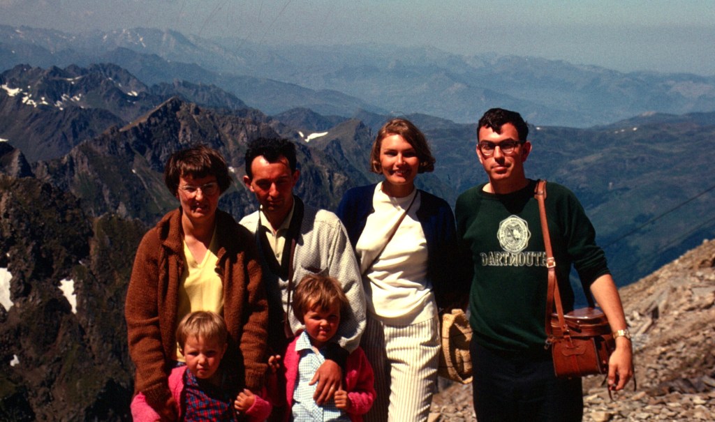 A view of Mont Blanc after a fresh snow, above Le Tour in the Chamonix valley. 1970.Le Petit Pèlerin among the Aiguilles de Chamonix. This summit is easily accessible and an easy ascent. The Aiguilles de Chamonix are legendary for European climbers. One of the highest cable cars in the world will take one to the summit of the Aiguille du Midi, and, if one wishes, over the Vallée Blanche and down to Courmayeur in Val d’Aosta in Italy. WikiCommons: Topo camptocamp.org.At the summit of the Petit Pèlerin, Pierre, a Chamonix guide and climbing instructor. Below, the valley of Chamonix looking up the valley toward Switzerland.