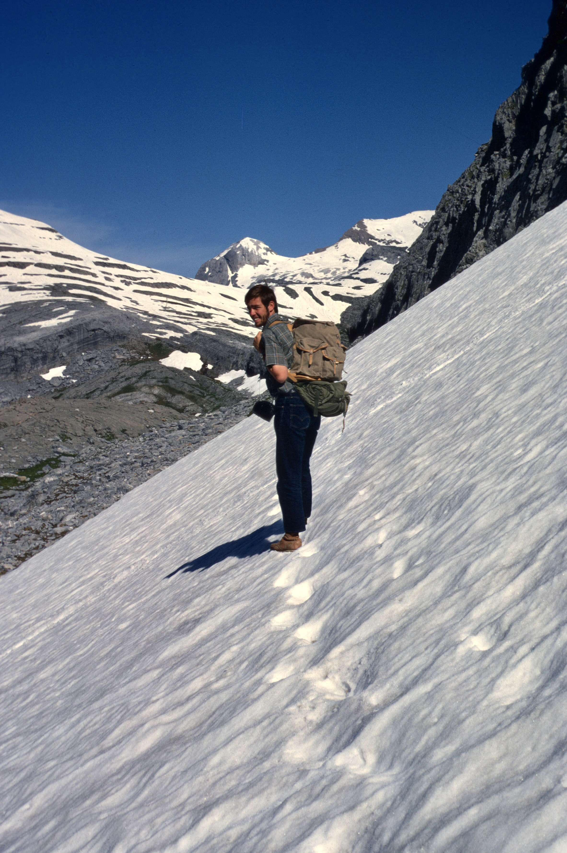 In a forested area, just off the path, the rushing water in the gorge beside us made for a damp evening as well as a loud one. In the morning, we noticed bear tracks on the trail. We had no protection against bears, but Jim put a rock in a tin can, the idea of which is that the rattle might prevent us from startling a bear. We jangled along and never saw any bears.