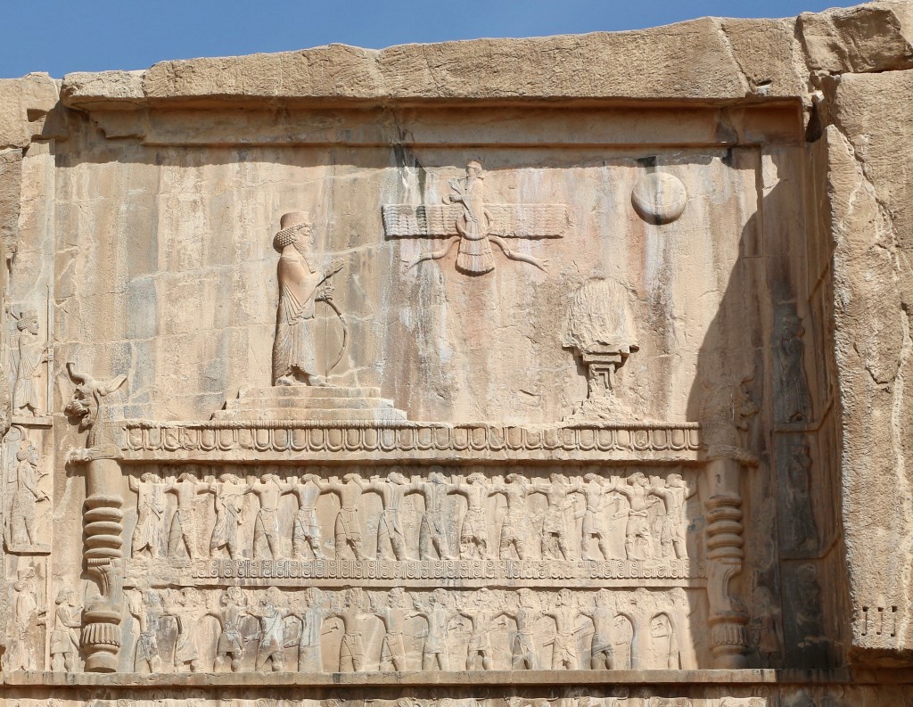 The tomb of Anaxerxes III at Persepolis. The king is making offerings to Ahura Mazda, god of the Zoroastrians. I took the photo at noon and the bas-relief doesn’t show well.“The Faravahar (Persian: فَرَوَهَر), also known as the Forouhar (فُروهَر) or Farr-e Kiyâni (فَرِّ کیانی), is one of the best-known symbols of Zoroastrianism, an Iranian religion.” From Wikipedia.In this detail of a photo from WikiCommons the faravahar is much clearer. Photo by Bernard Gagnon courtesy of Wikimedia Commons.