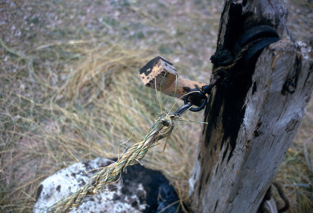 Halfa grows on drier soils as clumps, and is common in the Middle and Upper Moulouya River valley.Here the grass has been burned at the ground level. I assume this was part of the harvesting, but maybe there is another reason. Can a reader answer this question?The grass is collected in bundles where it will be spun into rope.The initial strands are then intertwined to make a useful rope.The post holds the strands in place.Setting up the final braiding.Preparing to twist the strands.The twisted strands at the post where they are tied off.Finally the braided strands are cut off and tied at the ends.