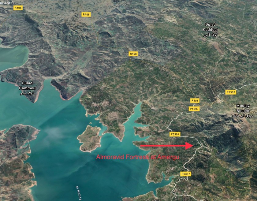 Cette carte des tribus du nord du Maroc montre les Fechtala (numéro 28) qui accueillent le moussem de Moulay Bouchta.Moulay Bouchta est situé à l’ombre d’Amergu. La forteresse almohade se voit clairement au centre droit de cette photo Google Earth.Les visiteurs déambulaient le long du sentier principal menant au sanctuaire. C’est le matin. En bas, près de la route asphaltée, on peut voir les tentes du gouvernement au loin à l’extrême gauche.Les artères principales du village de tentes étaient bondées de commerçants.Ci-dessus un commerçant vend des bottes en caoutchouc, pratiques pour le temps frais et humide à venir.L’artère principale menant à la porte du sanctuaire.Ce cordonnier était là pour réparer les chaussures.Le fast-food style moussem.Ces messieurs confectionnent des vêtements féminins sur mesure.À mesure que le jour avançait, la foule devenait de plus en plus dense.Cette jeune fille s’accroche à son père……pendant que sa mère ou sa sœur marche à côté.L’après-midi, les gens se rapprochent du sanctuaire où ils peuvent mieux regarder la procession.Comme tout le monde, les Marocains aiment les friandises; ce vendeur offrait une bonne variété de bonbons et de biscuits.Près du sanctuaire, les boutiquiers vendaient des chandelles en guise d’offrandes ou de souvenirs. Les messieurs à la droite ont trouvé bien amusant que je prenne cette photo.Plus tard dans la journée, un mouton est amené pour être vendu ou mangé.Les femmes rurales portaient souvent de grandes serviettes comme vêtement d’extérieur.Ce vendeur de bonbons errait dans la foule, tranchant des morceaux à vendre.La procession vers le sanctuaire a commencé au nord, en haut du village de tentes. Ensuite, on amènera un taureau en sacrifice. La structure qui ressemble à une tente est un nouvel emballage pour le tombeau de Moulay Bouchta.La procession descend dans la zone des tentes…….et le traverse en serpentant.La procession se poursuit. Les hommes défilent avec leurs mousquets.Ils poursuivent leur chemin le long de l’artère principale.De temps en temps les hommes tirent leurs mousquets.Des spectateurs se mettent le long de la route alors que les tirs créent des nuages de fumée.En défilant, ils continuent de tirer.Les spectateurs regardent d’en haut pendant que la procession entre dans un espace ouvert devant l’entrée du sanctuaire.Rendus là, les hommes s’arrêtent pour montrer leurs mousquets.…par un mouvement de va-et-vient….…jetant leurs armes dans l’air et les attrapant……avant de tirer dans le sol. C’est l’équivalent de la fantasia (tbourida) qui comprend également des exploits d’équitation.Le site se remplit de fumée de poudre à canon et les spectateurs se mettent à courir pour en sortir.Tout en haut, des femmes regardent……à mesure que la procession arrive à l’entrée du sanctuaire. À l’apogée de la cérémonie la foule s’enthousiasme et des activités religieuses commencent à l’intérieur du sanctuaire.