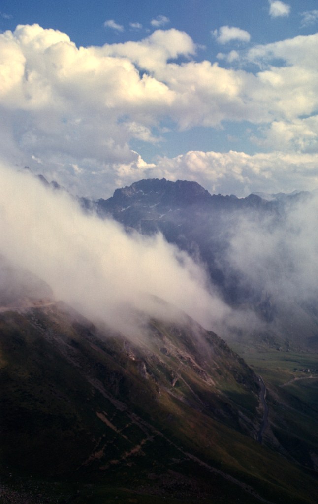 From Tourmalet down, the few cars that passed us did not stop. We had decided to head to the closest ski resort, La Mongie, a few thousand feet and four kilometers away. The clouds evaporated. The night was clear and a full moon lit the ridges and valleys. The heights cast deep shadows, and the sky was full of stars despite the moonlight. We were very tired when we reached the resort, but not exhausted. When we arrived, the desk clerk expressed surprise that he had not heard a car—few guests arrived without one. The hotel was virtually empty. La Mongie in those days was a place for winter fun, and today is one of the largest ski centers in the Pyrenees. Since the road we walked to the summit is now closed, most of today’s visitors take a cable car from La Mongie.