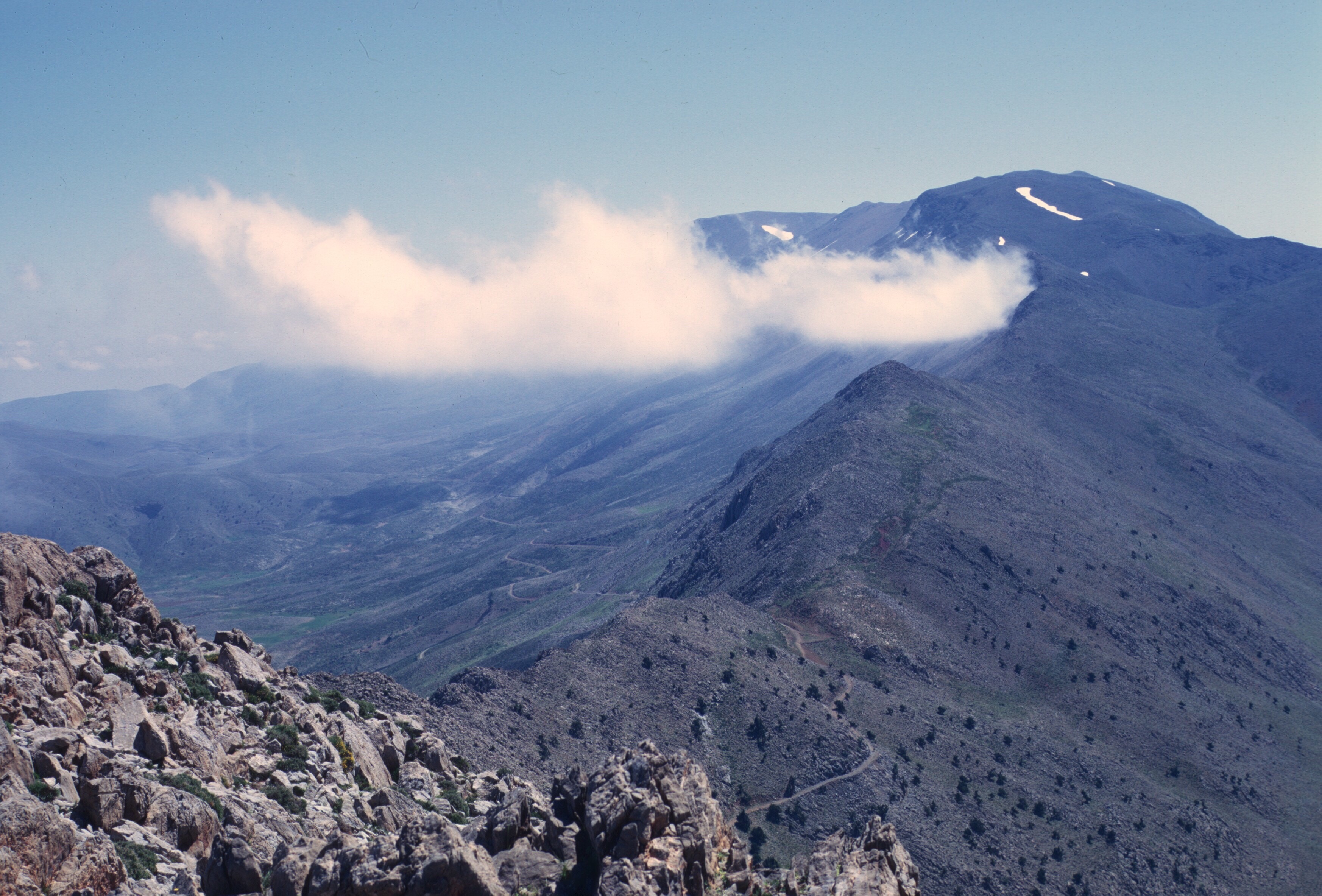 The mountain had snow, and the view at sunset was memorable. The snow-covered summits of Bouiblane and Bou Naceur were sandwiched between the setting sun and the clouds, in a terrific vista.