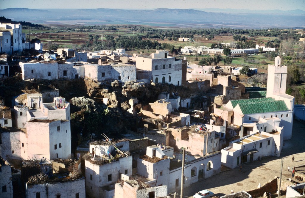 Vue vers le sud-est. Le cimetière juif est situé en bas à gauche de la photo. Sefrou occupe un bassin dont la majeure partie est entourée de collines. 1969