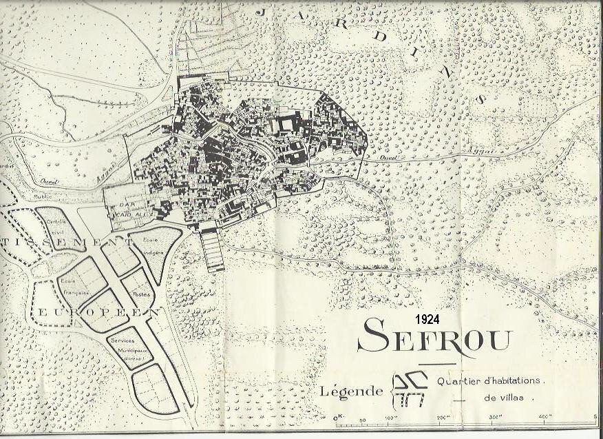 « Une ville enfouie dans les arbres » Carte postale ancienne avec une partie de la Kelaa au premier plan à gaucheUn plan ancien de Sefrou montre presque toutes les structures de la ville enfermées derrière son mur défensif. Les Français développaient la zone située à l’extérieur du mur, à l’ouest, pour eux-mêmes. Ma maison, à l’intérieur du mur, n’avait pas encore été construite et son emplacement était encore un jardin. Plan de la ville de Sefrou. 1924